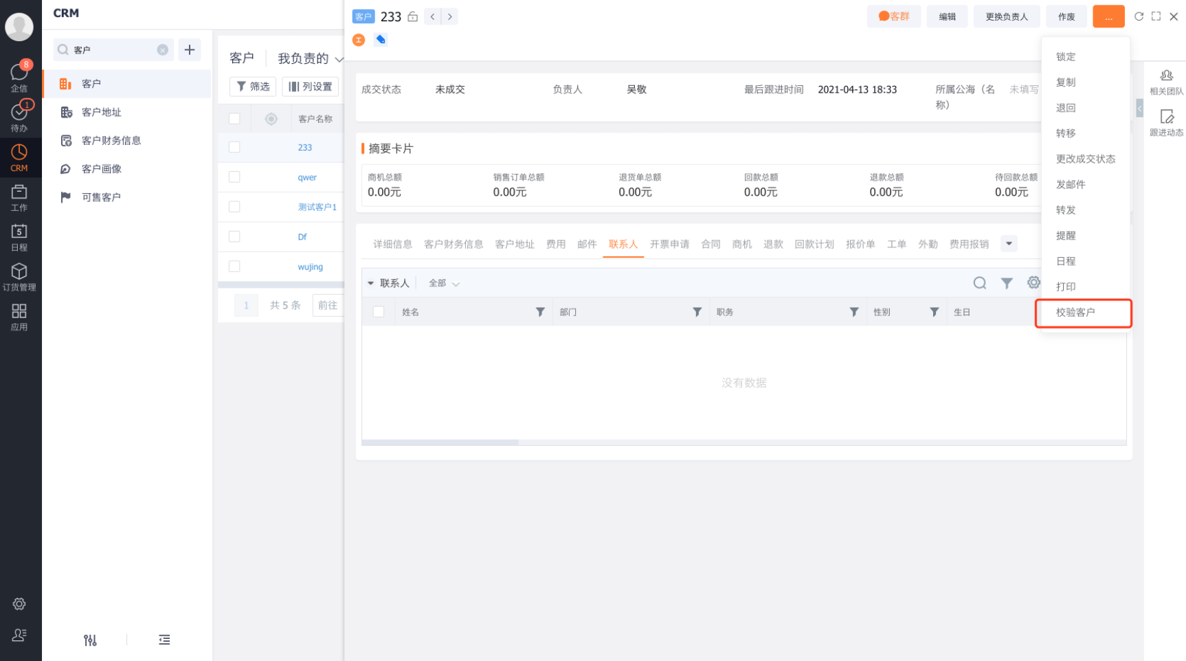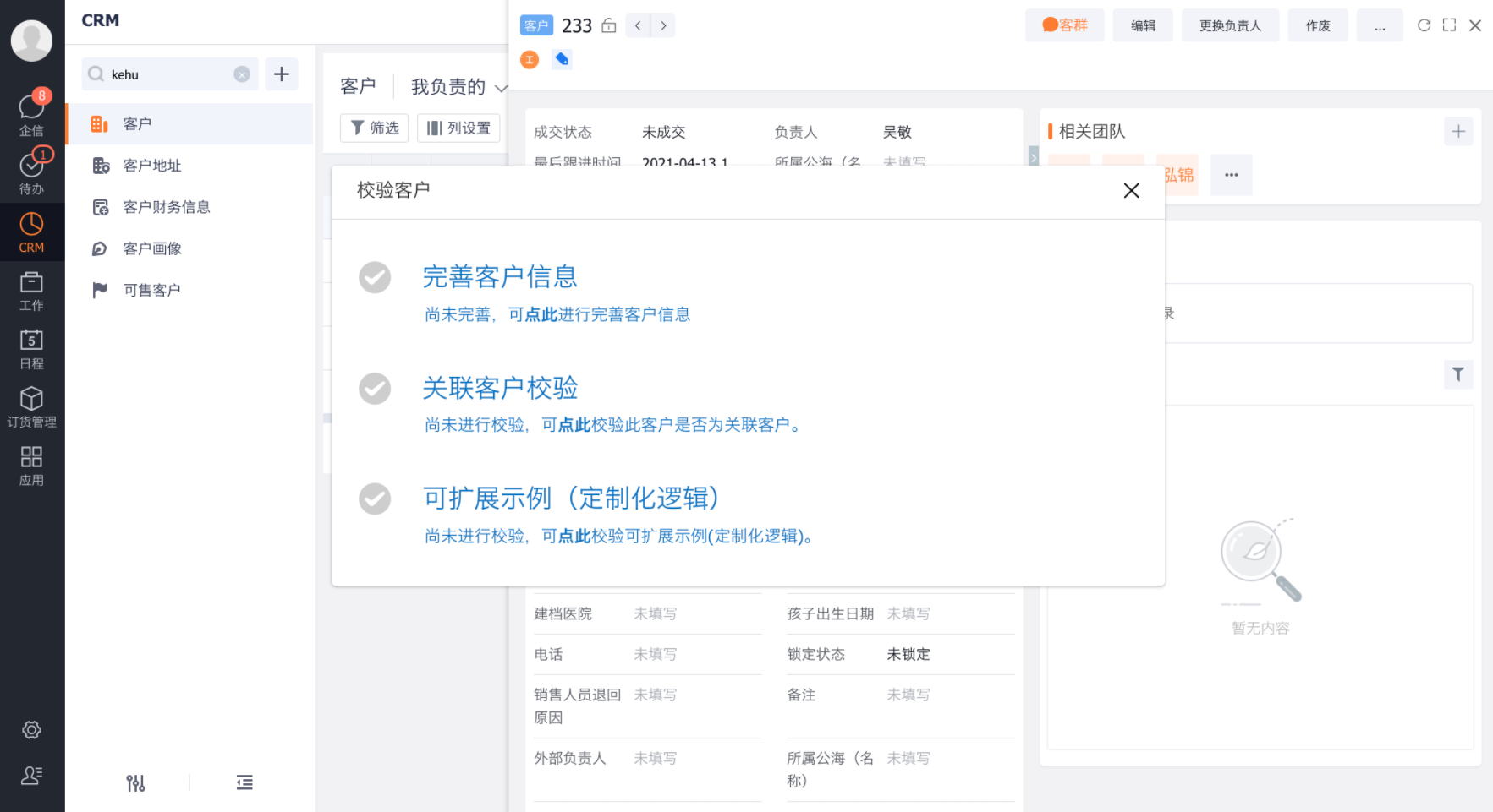 源码.zip (15.6 KB, 下载次数: 17)您可以选择将组件放置您需要的且自定义组件所支持的任意位置,本示例以客户下自定义按钮的UIAction为例,配置方式并不唯一。在客户下创建一个名为【校验客户】的自定义按钮: