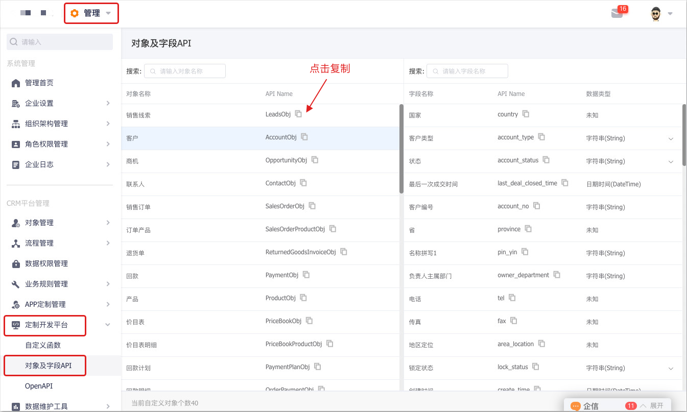 登录Web端纷享销客,进入【管理】频道,打开【定制化开发】选项下的【对象及字段API】页面,即所有对象及每个对象的字段API Name都会在此显示,点击API Name后面的复制图标,可一键复制到函数编辑器内