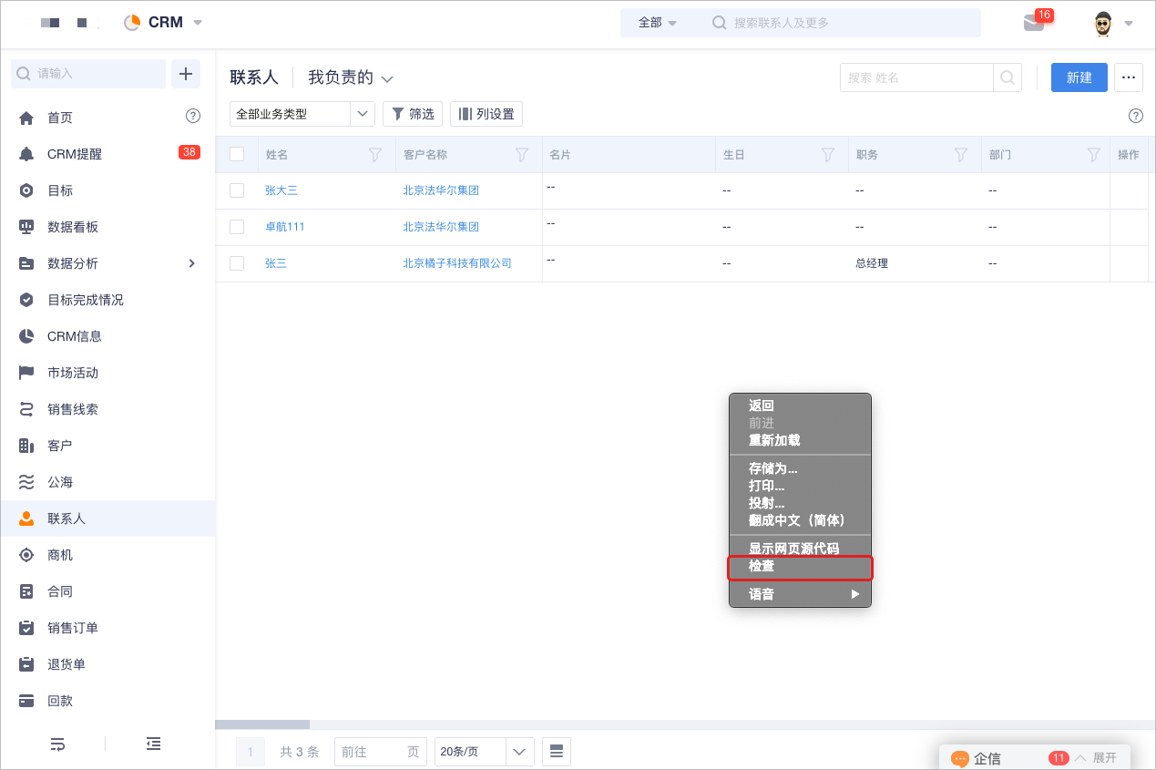 • 在要查找的对象列表页右键后点击【检查】,进入开发模式