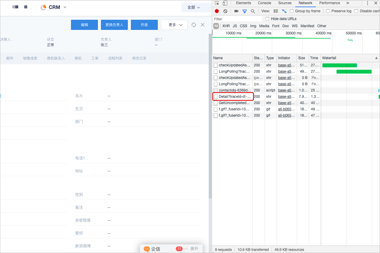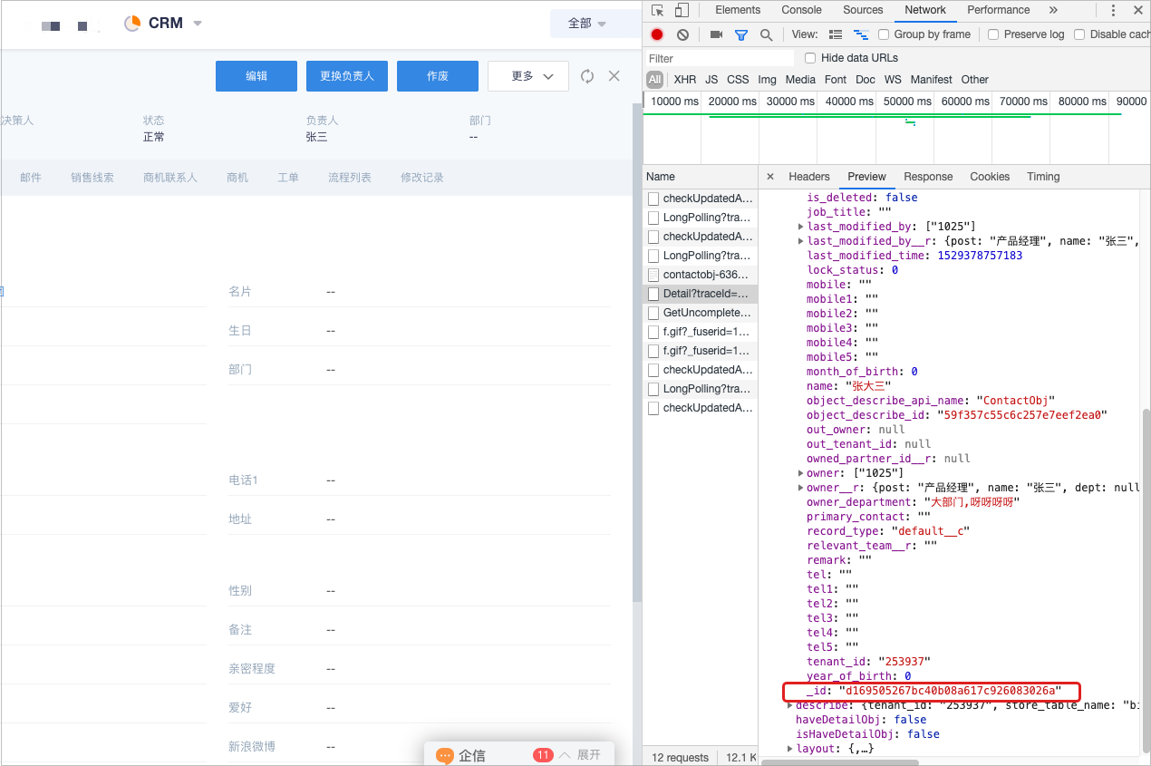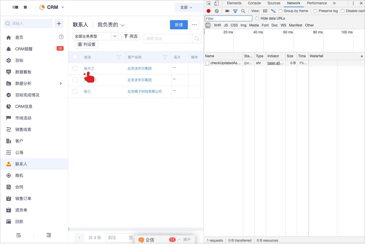 • 在开发模式中切换到【Network】下然后在左侧页面下点击要查找的对象实例,如下图点击张大三