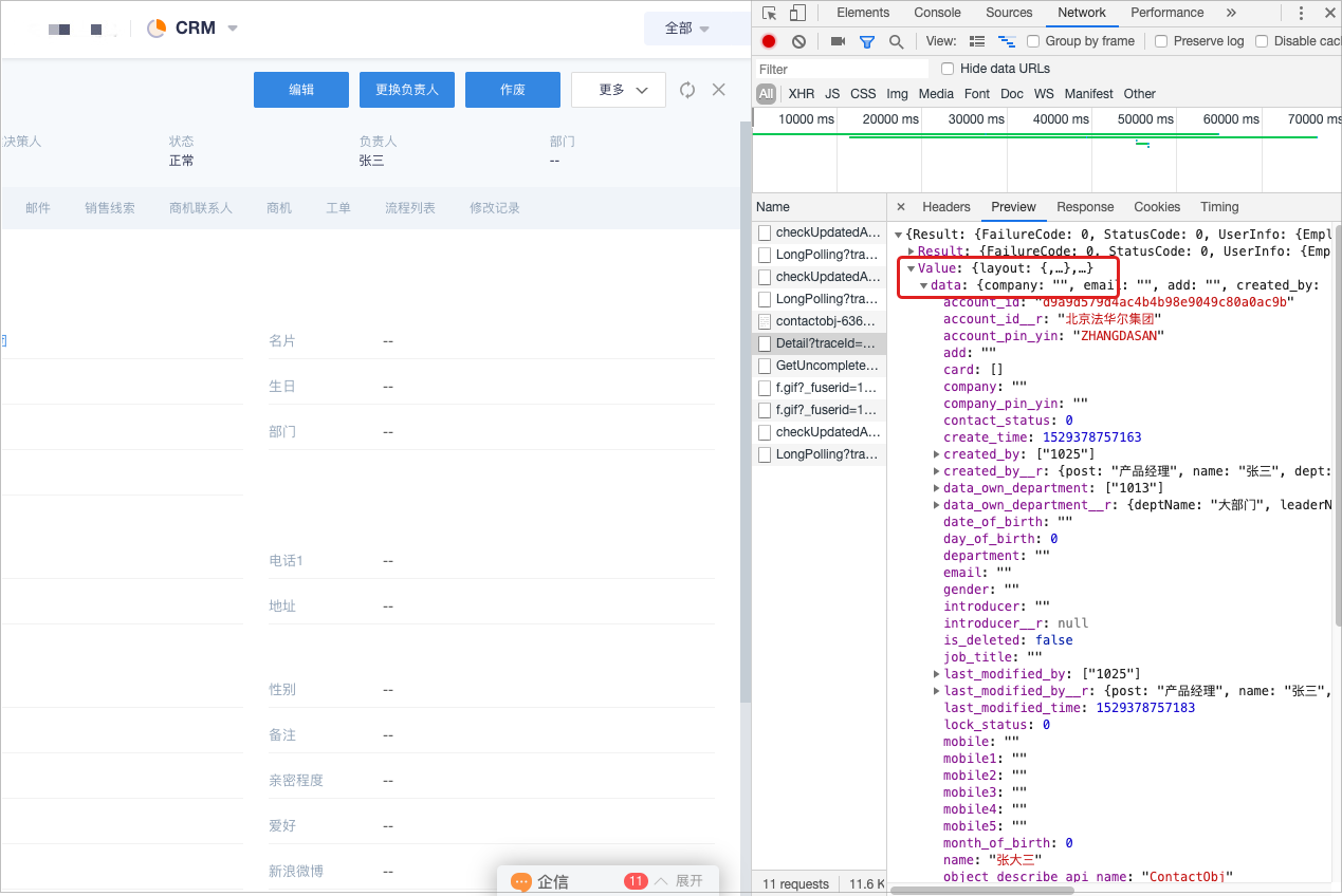 • 在右侧找到Value下的data数据下加载了所有该联系人的参数信息