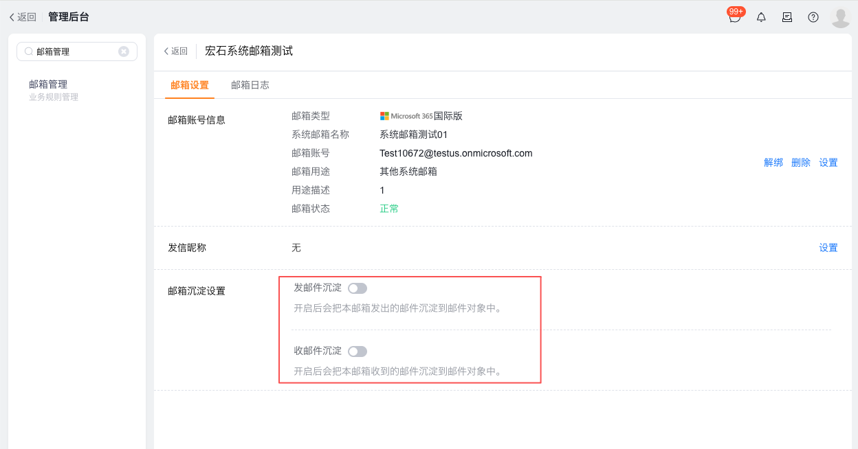 系统邮箱发送邮件,也支持沉淀到邮箱对象,每个系统邮箱需要单独开启沉淀功能。