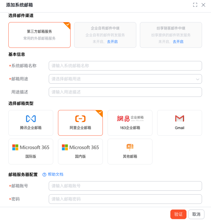 系统支持三种邮件渠道,企业按需开通使用,默认提供的是第三方邮箱服务。如需使用企业自己邮件中继服务或纷享提供的邮件中继服务,可以参考 管理员指南:邮件中继 配置。