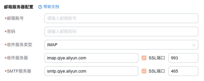说明:绑定邮箱所用的发件服务器,若不清楚如何添加,可登录使用的企业邮箱帮助中心,搜索“SMTP”关键字获取配置信息。