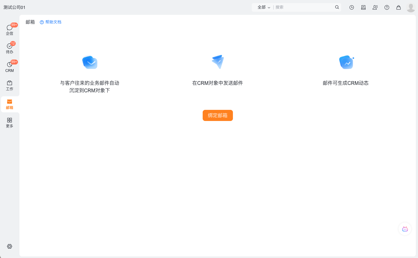 1. 入口路径:登录纷享销客web端界面,点击主导航【更多】找到【邮箱】,再点击“绑定邮箱”。