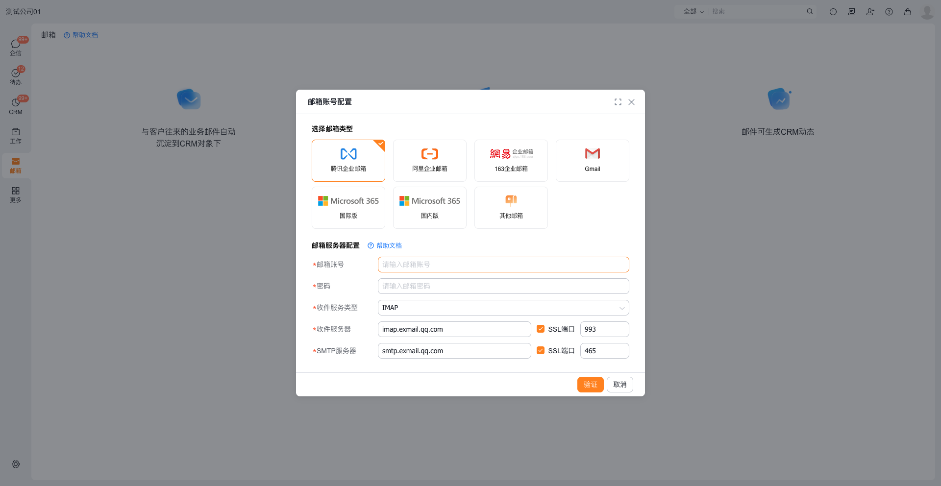 - 输入邮箱帐号、密码后点击验证,通过邮件服务器验证后即可完成绑定。邮箱绑定成功后,进入邮箱,即可进行邮件的查看、发送、管理。