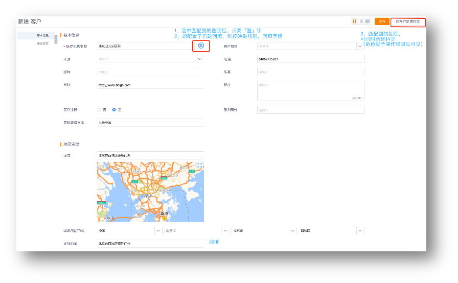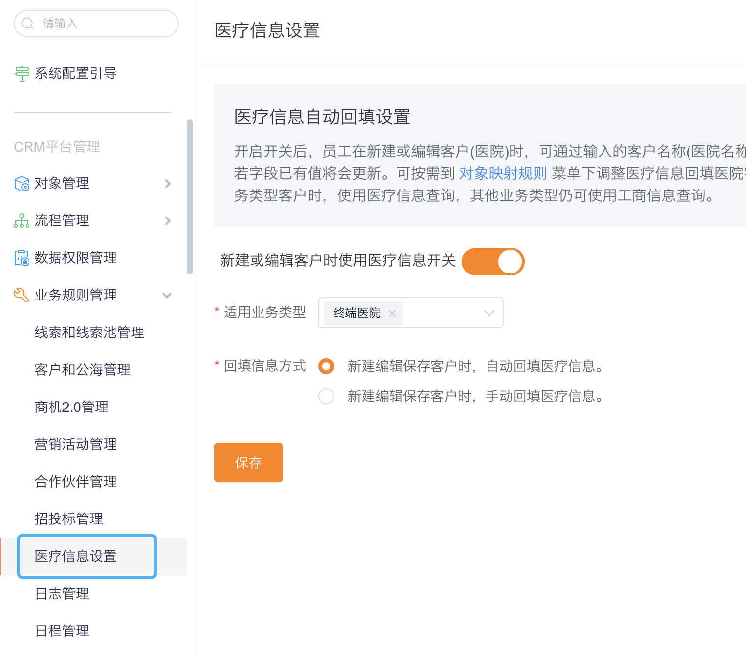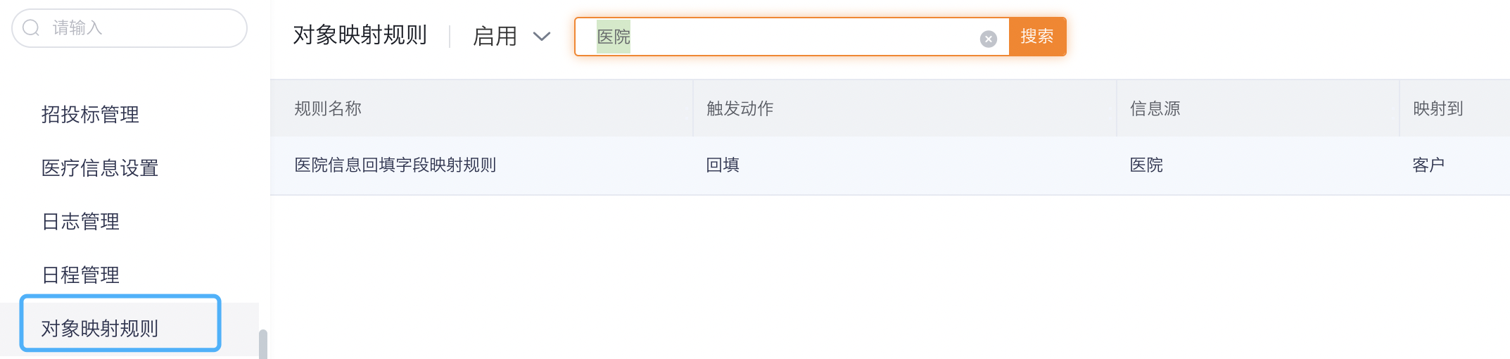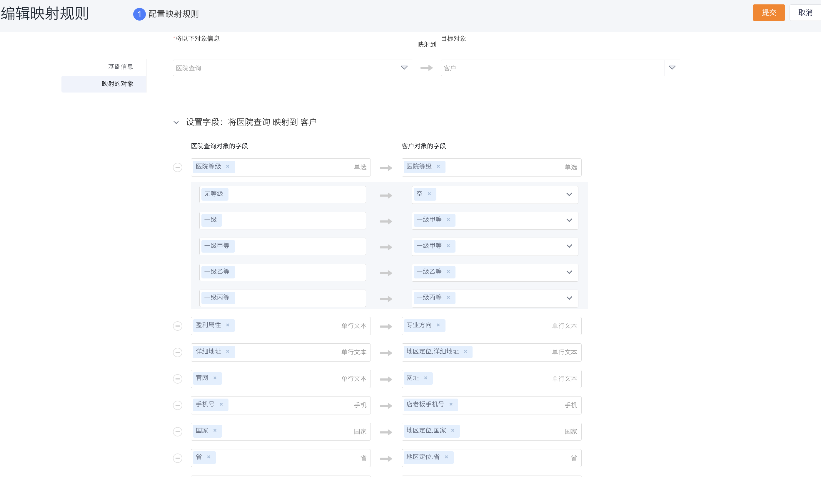 管理员设置将「医院」的哪些字段信息,回填到「客户」的哪些字段信息上,系统会默认预设一个规则,但系统不了解企业实际的字段情况,所以需要管理员按实际情况再做一下调整。