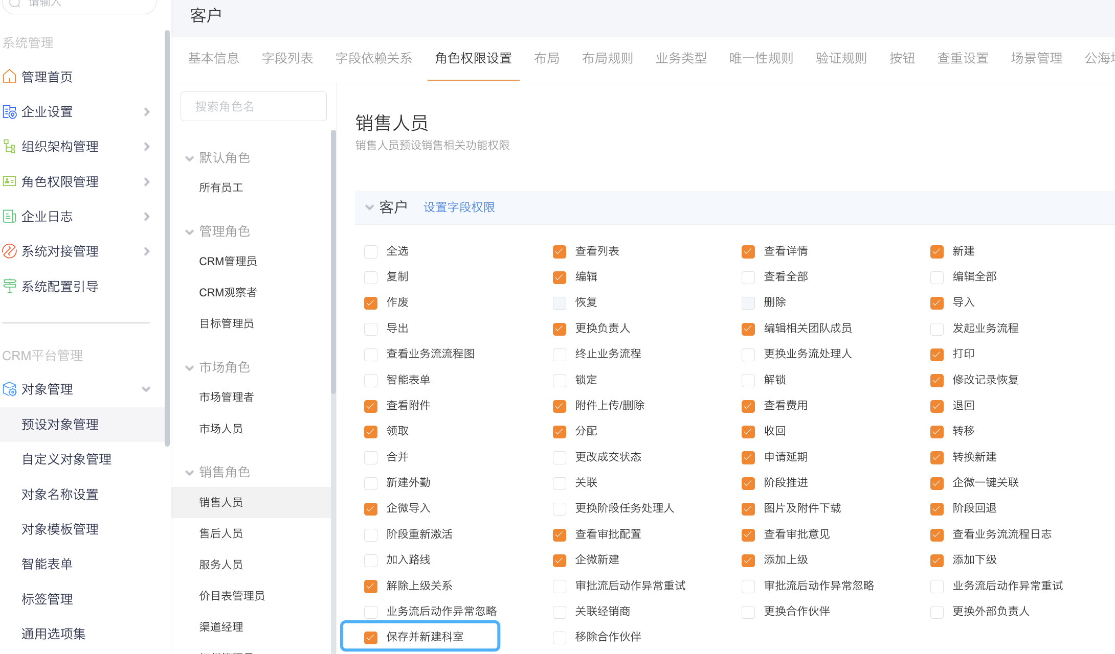 如果企业不需要在新建客户的时候,可以同时保存并批量新建科室,则可以直接到管理后台-预设对象管理-客户-按钮下,将「保存并新建科室」按钮禁用掉。