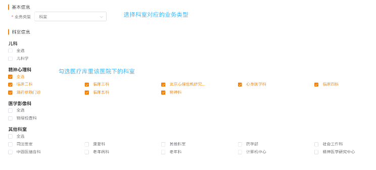 因为在新建医院的时候,也可以同时批量自动创建其下的科室,故也需设置将「科室」的哪些字段回填到「客户」的哪些字段上。