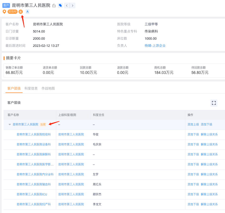 将自动把科室和医院通过「上级客户」字段关联起来(适用于通过客户自关联管理医院和科室数据的企业)。