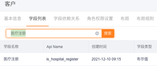 此类通过医疗库创建的医院/科室,将通过「医疗注册」的值为「是」标识。此字段为预设字段,如需,可自行添加到详情页布局 和列表 查看。