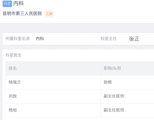 点击科室名称,可进入科室详情页,查看科室详情和科室下的医生。(目前还不支持医生的批量新建,仅支持在科室详情页查看医生信息。)