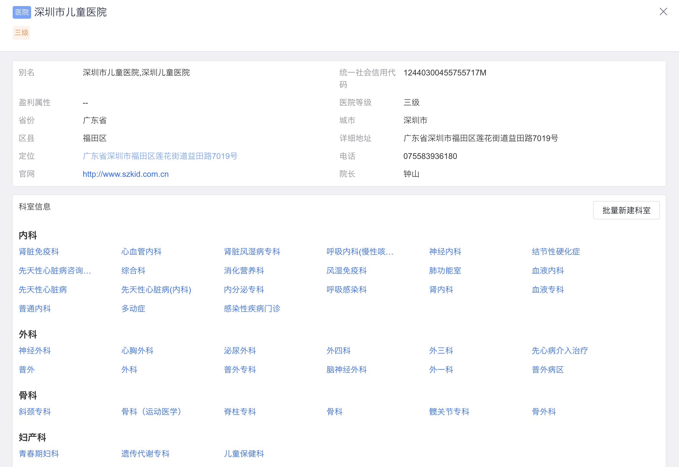 从客户详情页,点「医」字进入详情页,科室列表可进行「批量新建科室」