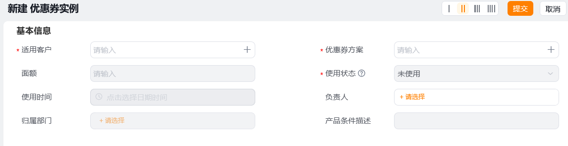 - 优惠券方案:选择一个券方案,表明当前券实例是按这个优惠券方案的规则使用的。