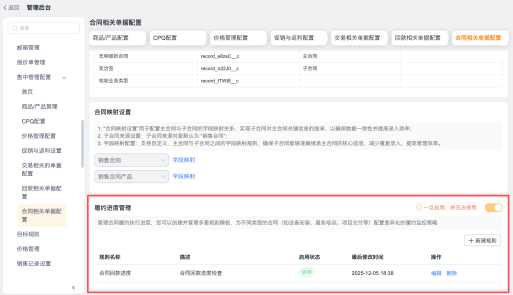 | 合同产品 | 指示规则将以合同中的具体产品名称作为考核指标 | 设定后,前台用户在使用该规则时,可从当前合同的产品明细中选择具体产品名称作为履约指标 |
