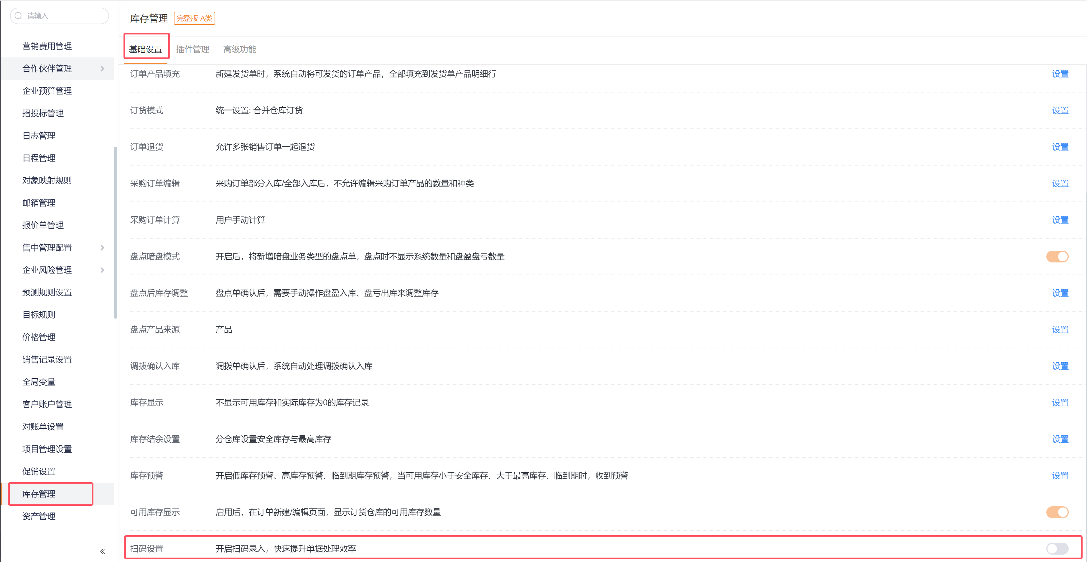 开启路径:CRM管理后台->CRM平台管理->业务规则管理->库存管理->基础设置->扫码设置。