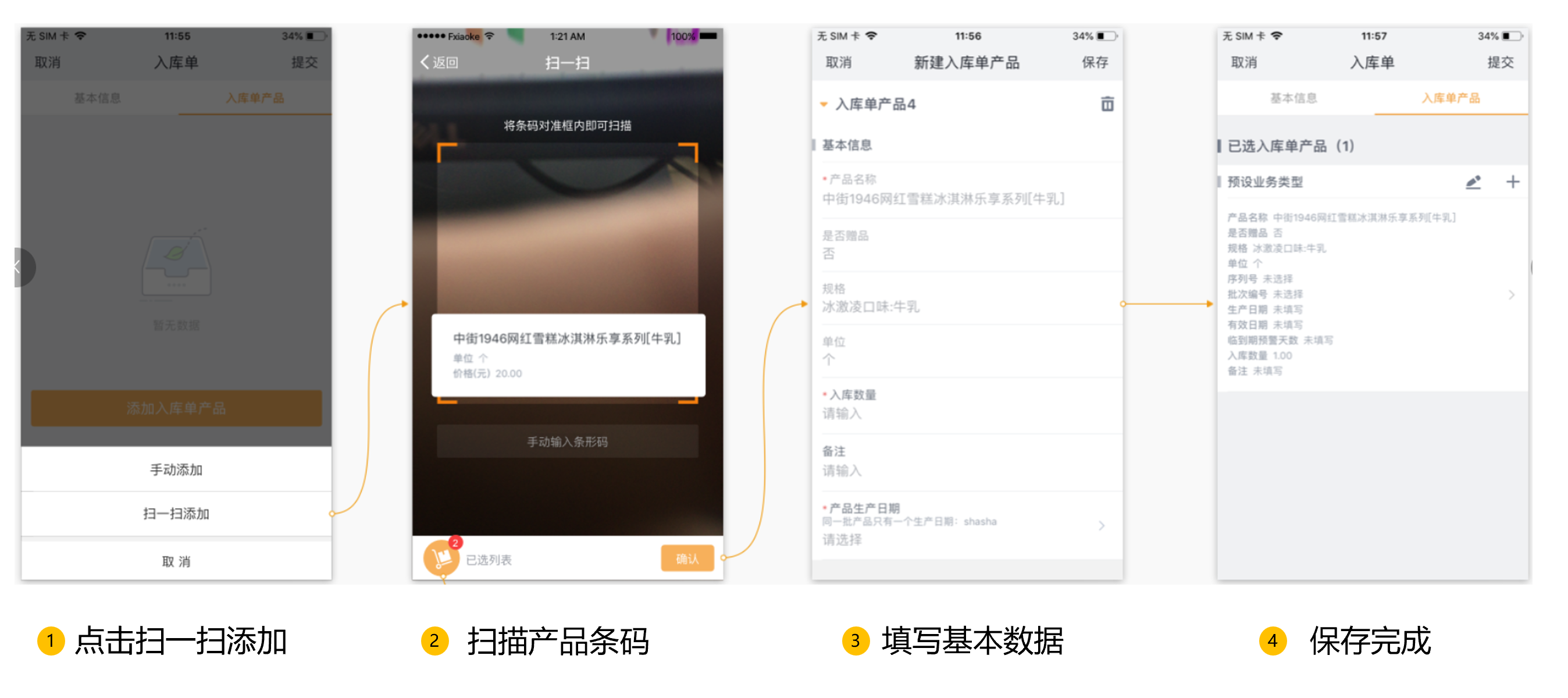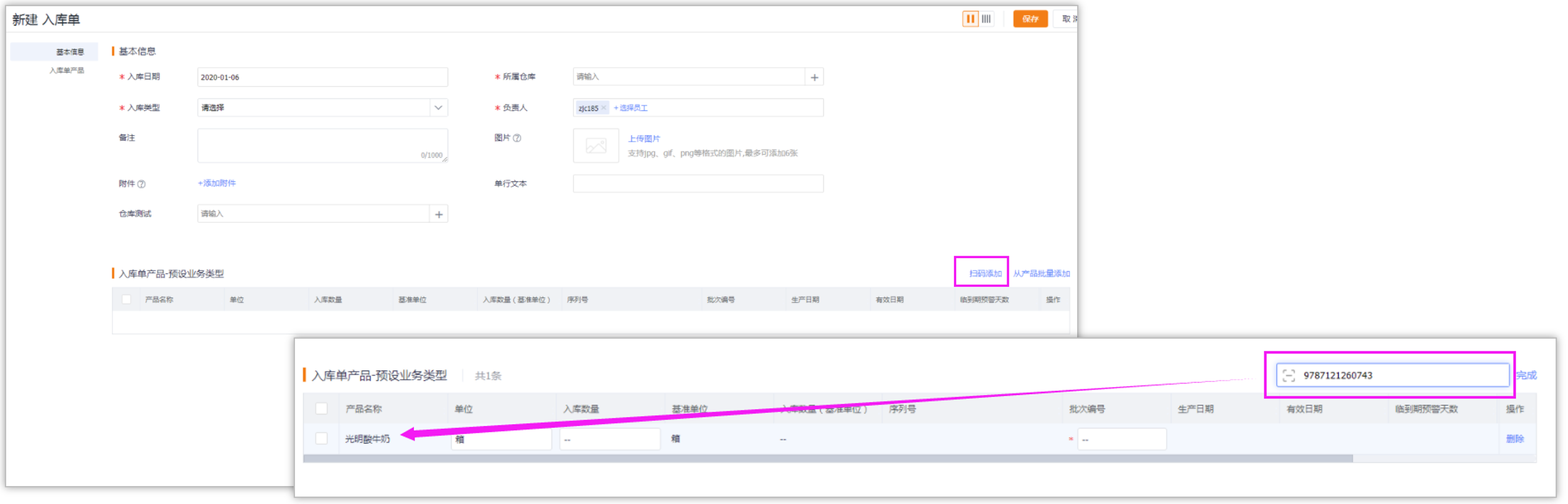 - 以入库单为例,扫描了产品上的条码后,系统会自动匹配相应的产品,并填入入库单产品中。
