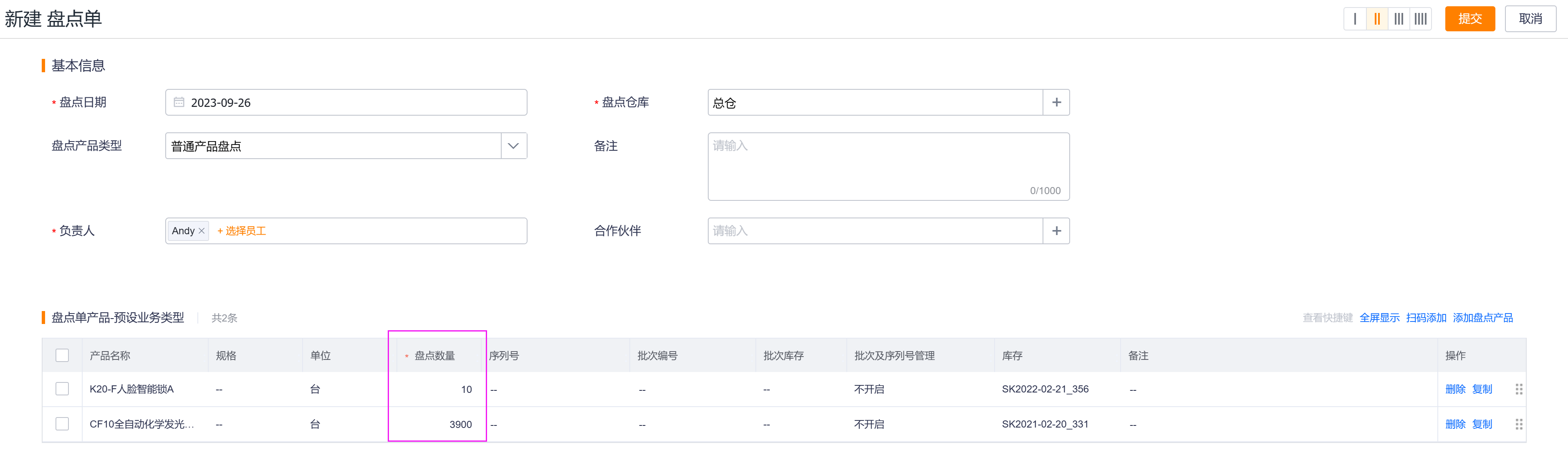- 产品:可以盘点任意产品,无论仓库中是否有对应的库存记录,也可以同时盘点开启了批次/序列号的产品。