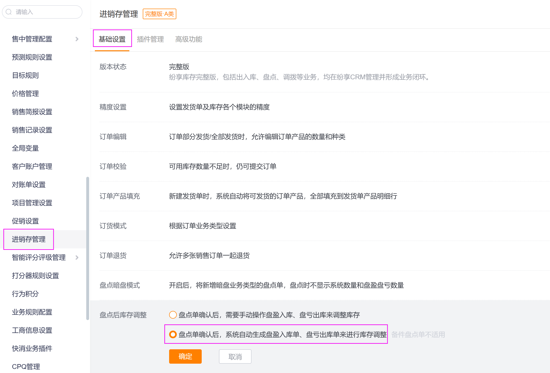 - 管理员可在进销存管理->基础设置->盘点后库存调整,设置盘点单确认后,系统自动生成盘盈入库单、盘亏出库单。