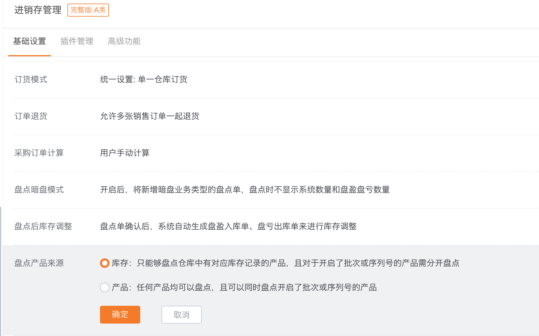 - 进入进销存管理,设置盘点产品的来源,可选项包括:库存、产品。