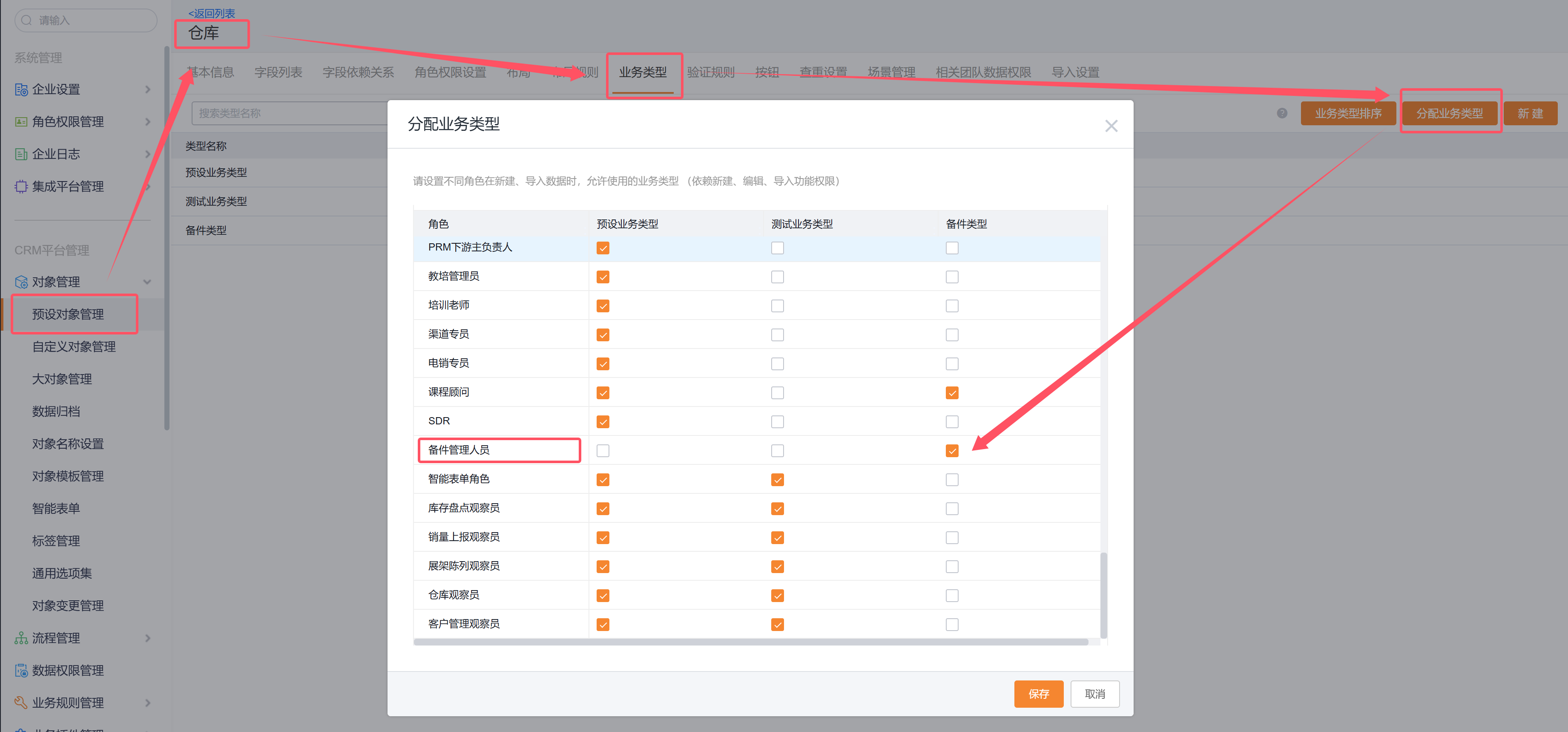 在使用备件库存之前,需要给对应的角色分配仓库的备件业务类型,路径为:CRM管理后台->CRM平台管理->对象管理->预设对象管理->仓库->业务类型->分配业务类型。