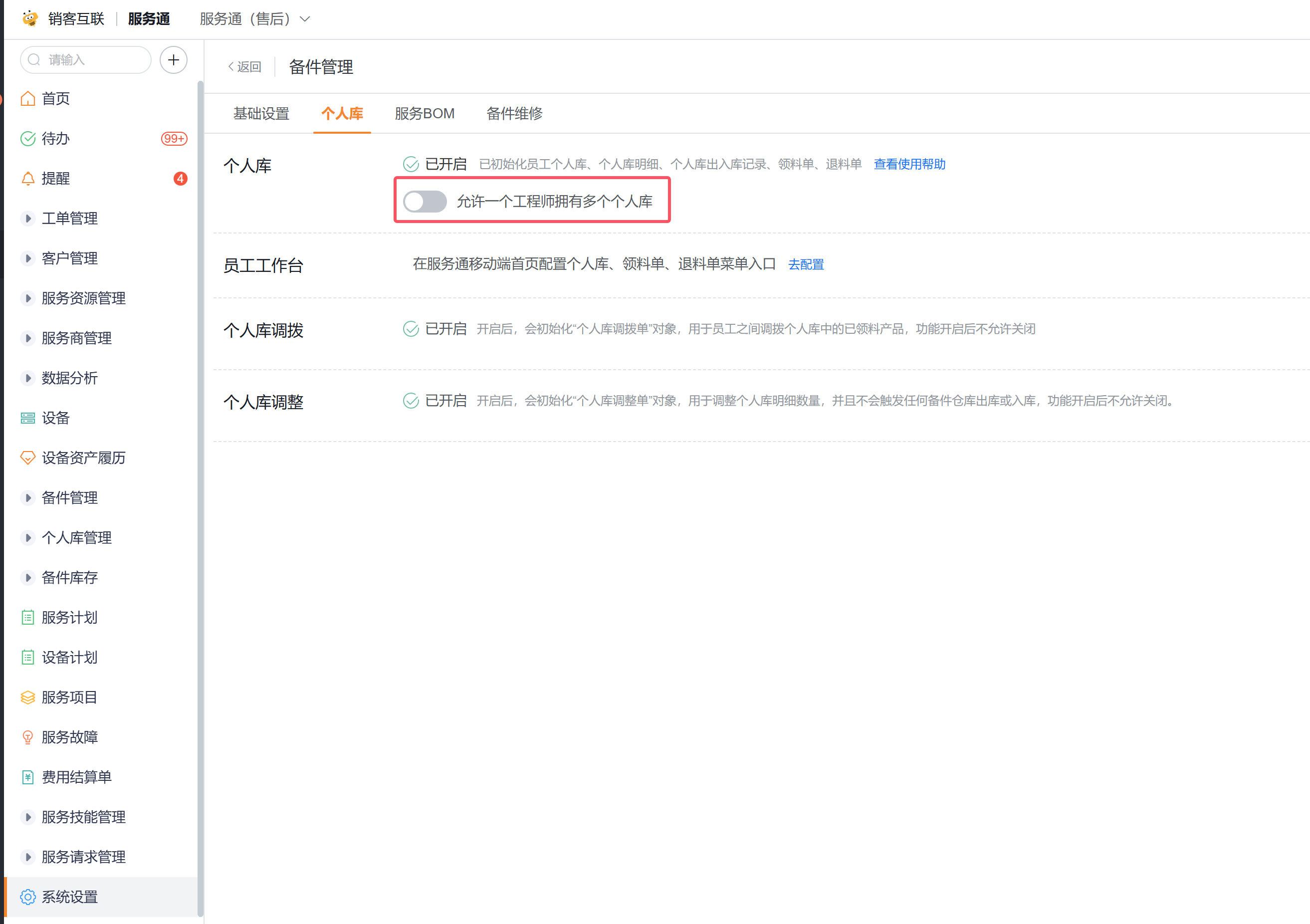 默认情况下,一个服务工程师只能拥有一个个人库,如果需要给工程师分配多个个人库,需要开启对应的参数,如上图所示,开启路径为:服务通应用->系统设置->业务插件->备件管理->个人库。