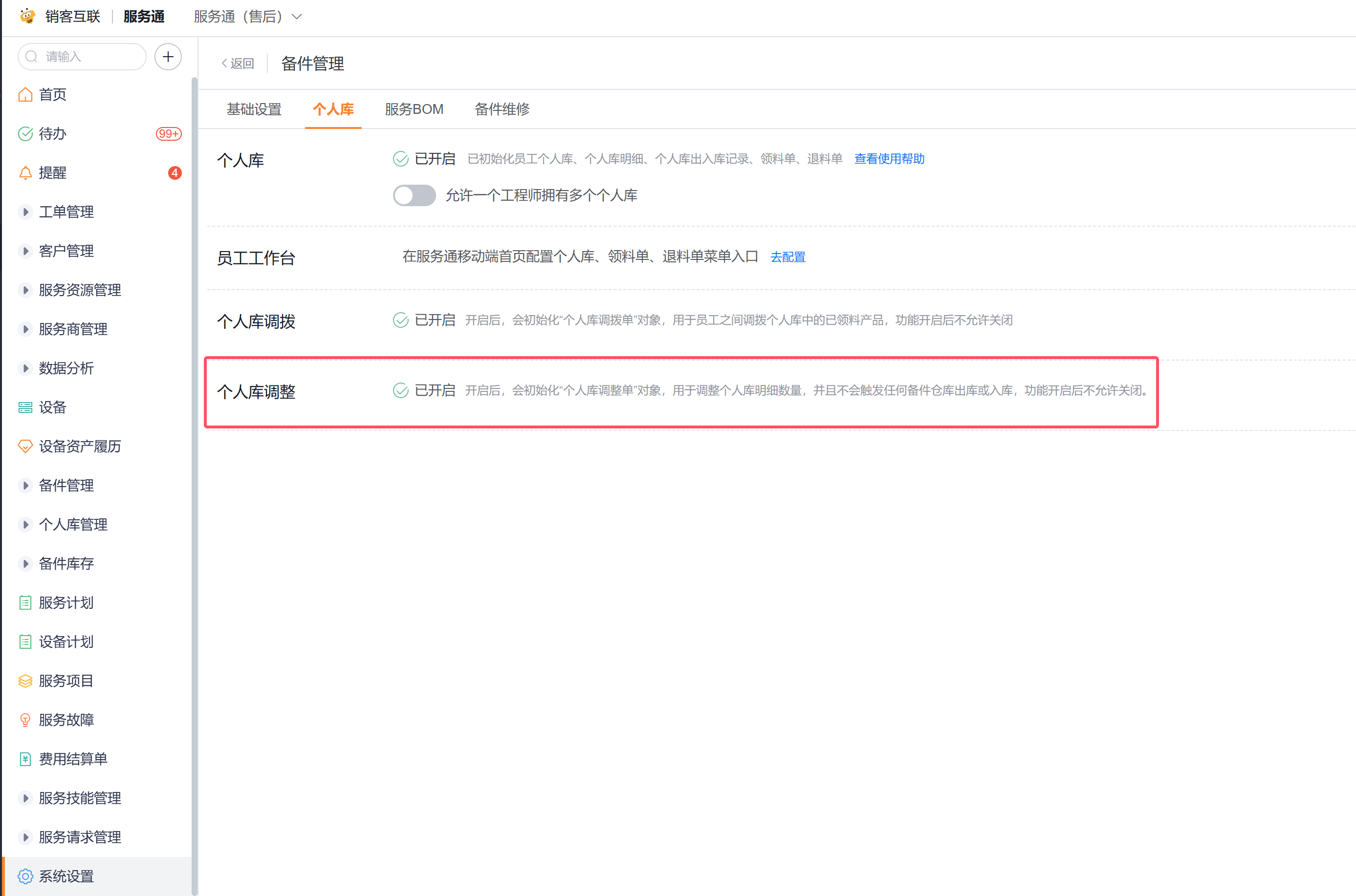 个人库调整单默认未启用,如果需要对工程师个人库的备件数据做调整,则需要开启个人库调整,如上图所示,开启路径为:服务通应用->系统设置->业务插件->备件管理->个人库。