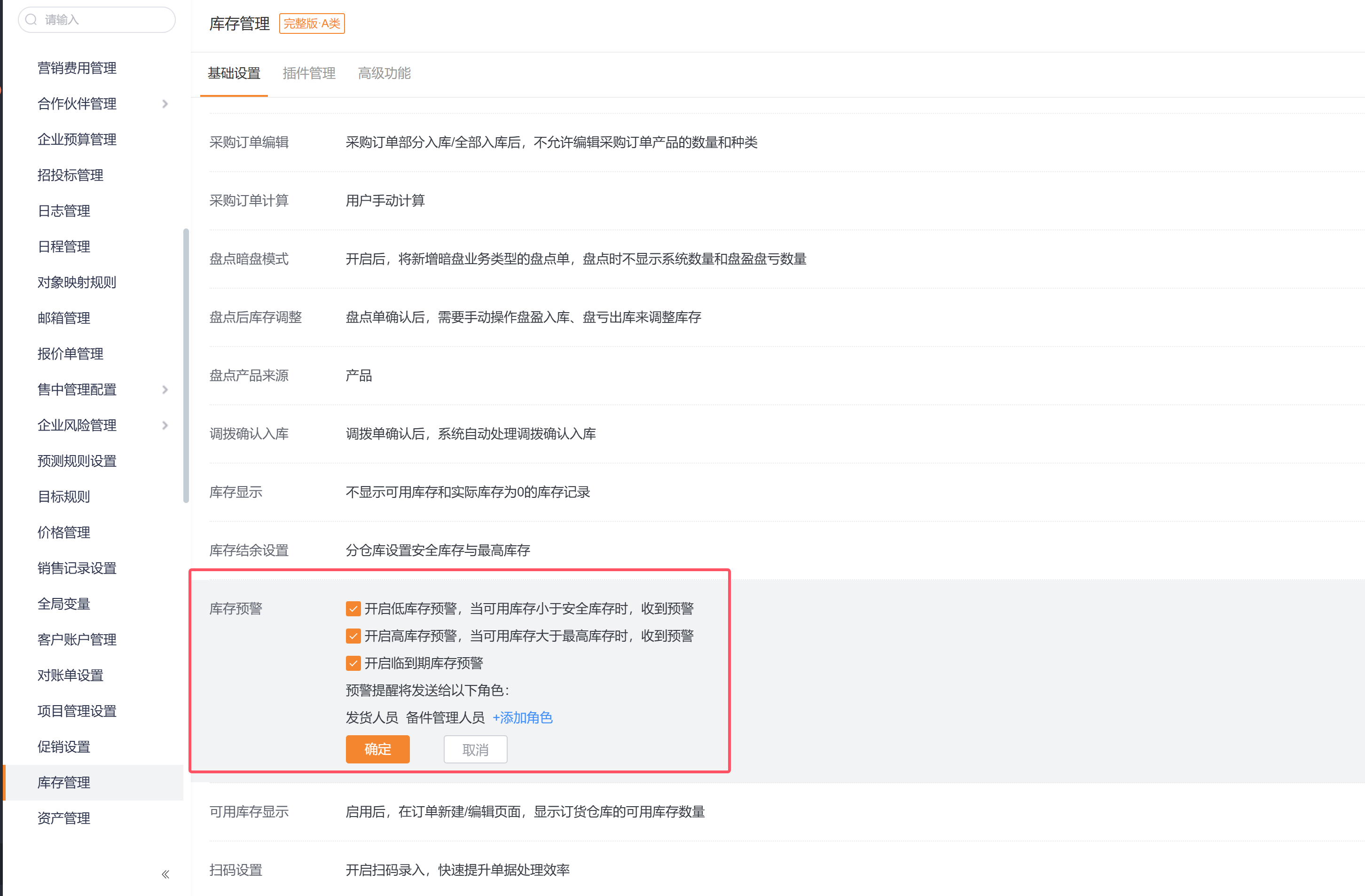 可在库存管理的基础设置中,设置库存预警,此设置对备件库存同样有效,路径:CRM管理后台->CRM平台管理->业务规则管理->库存管理->基础设置。