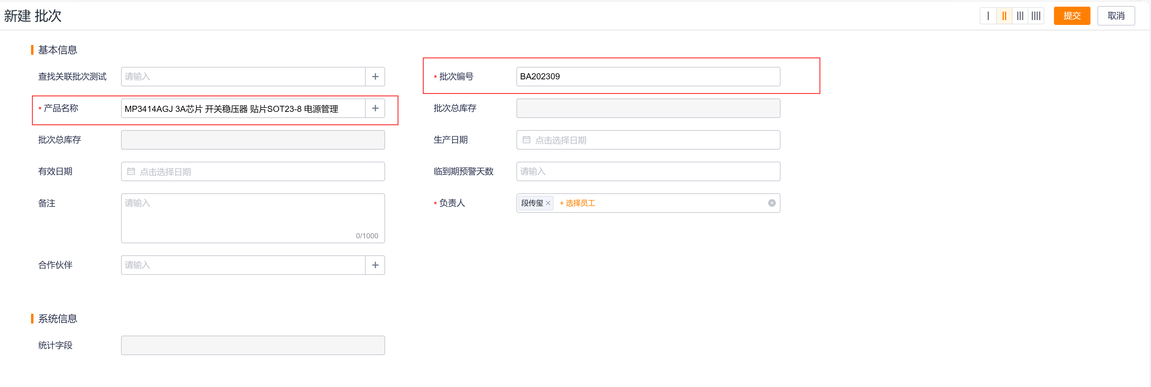 - 关联产品:新建批次时,必须关联一个具体的产品,关联的产品必须是“已上架”的产品,且开启了批次管理;