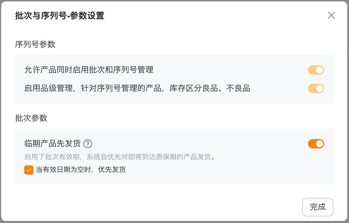 - 开启路径:CRM平台管理->业务规则管理->发货与库存管理->库存管理->插件管理->批次与序列号,点击参数设置,在弹出框中打开“临期产品先发货”。