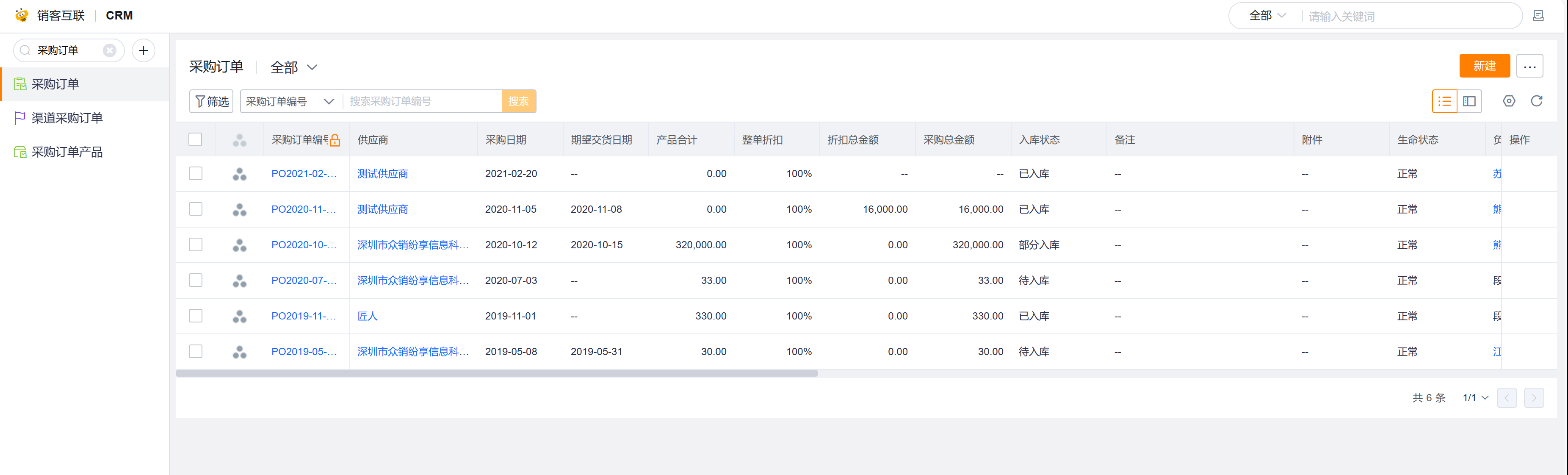 - 进入CRM,点击采购订单,进入采购订单列表页。