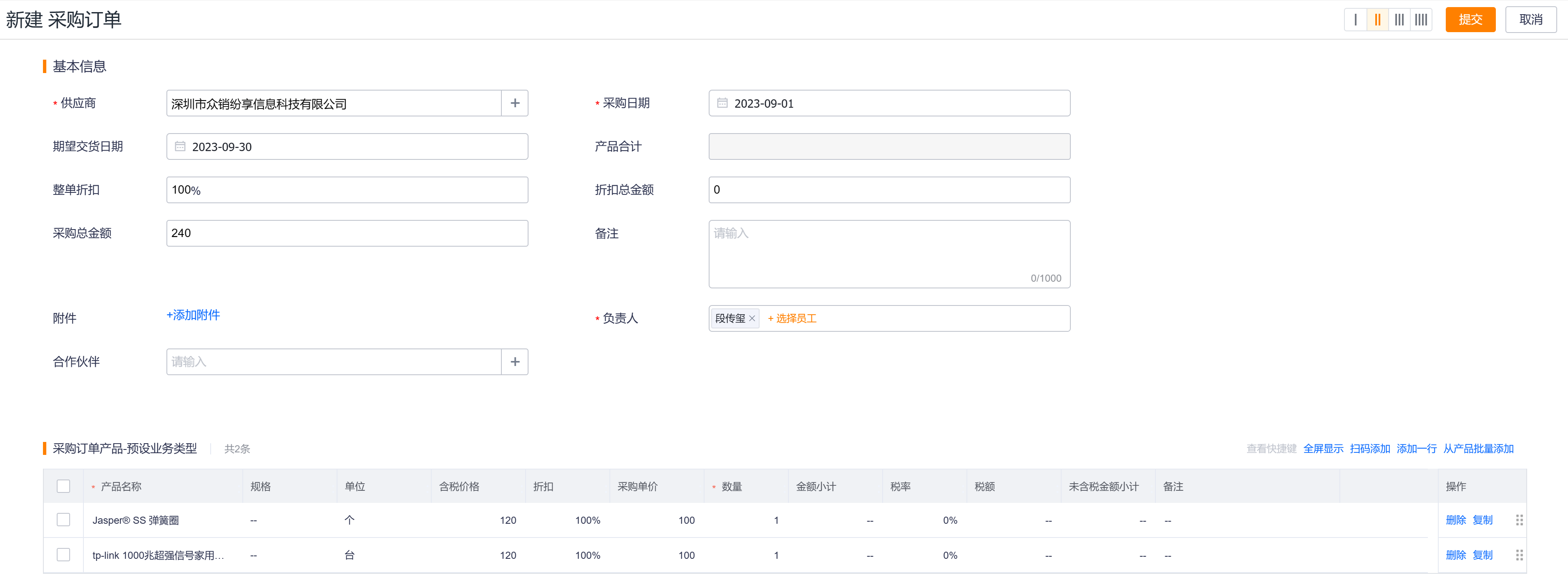 - 采购订单产品:数据来源于产品对象,但是产品的状态必须为“已上架”。选择了待采购的产品之后,输入采购的数量即可。