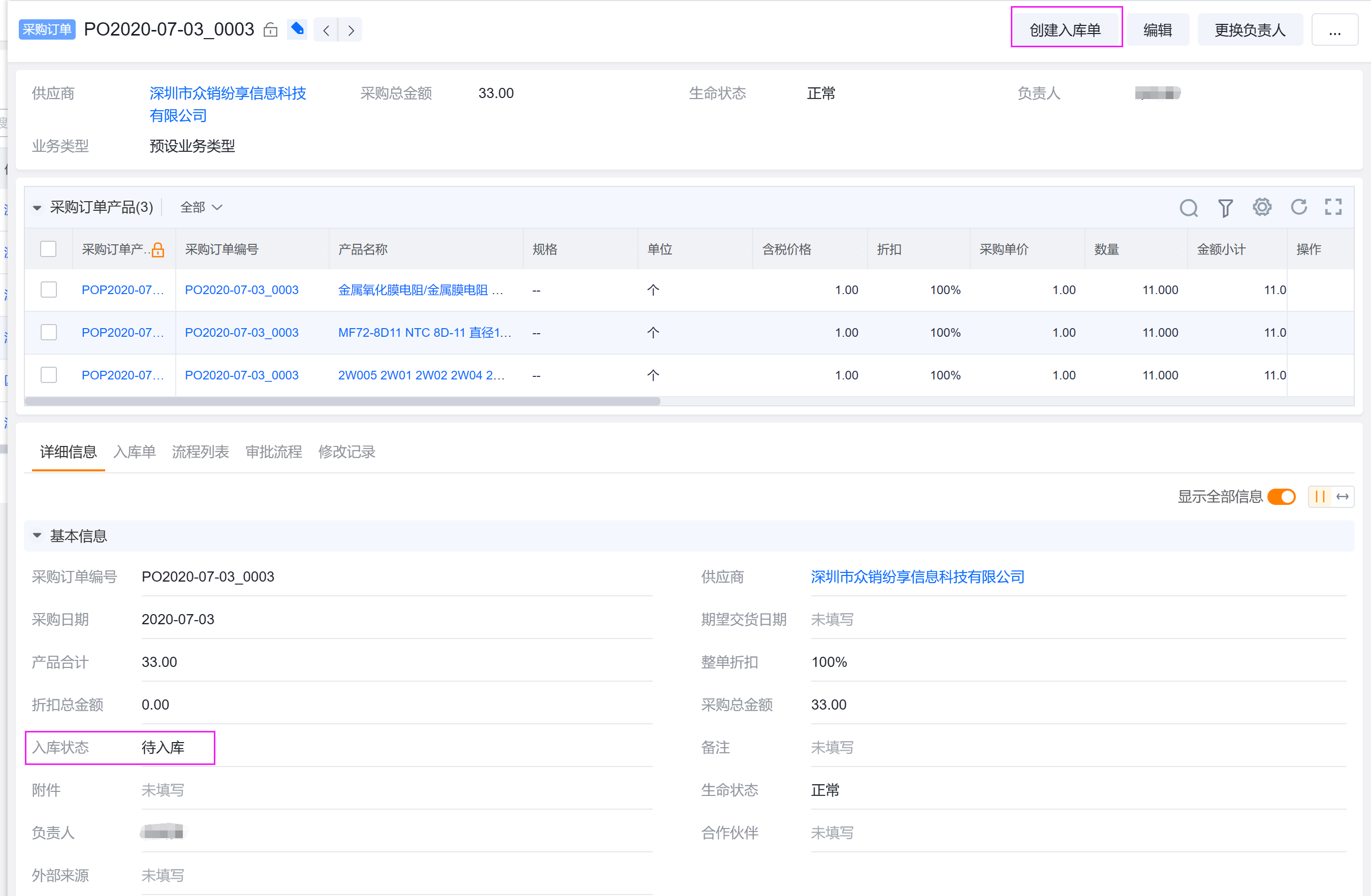 - 当所有采购订单产品均已入库后,采购订单的状态会变更为已入库。