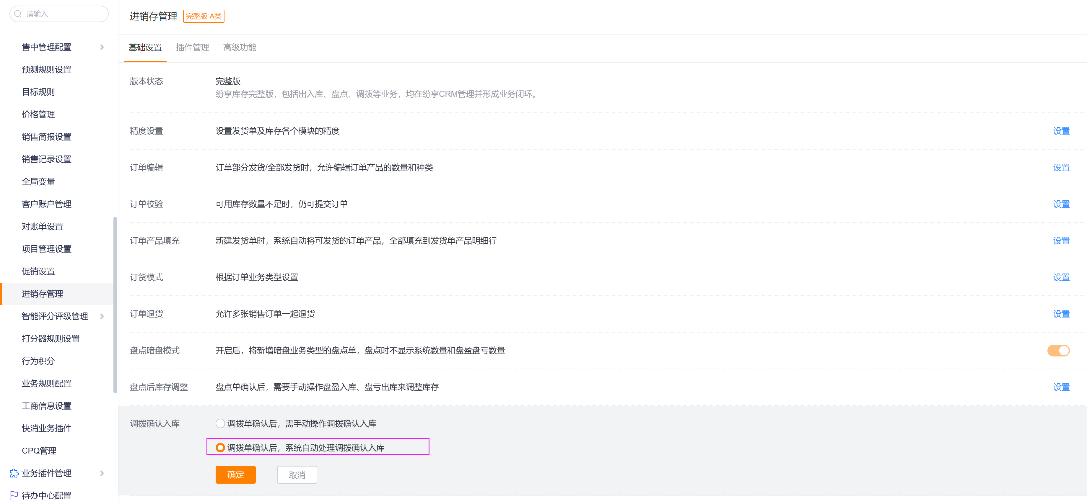 - 管理员可在进销存管理->基础设置->调拨确认入库,设置调拨单确认后,系统自动处理调拨确认入库。