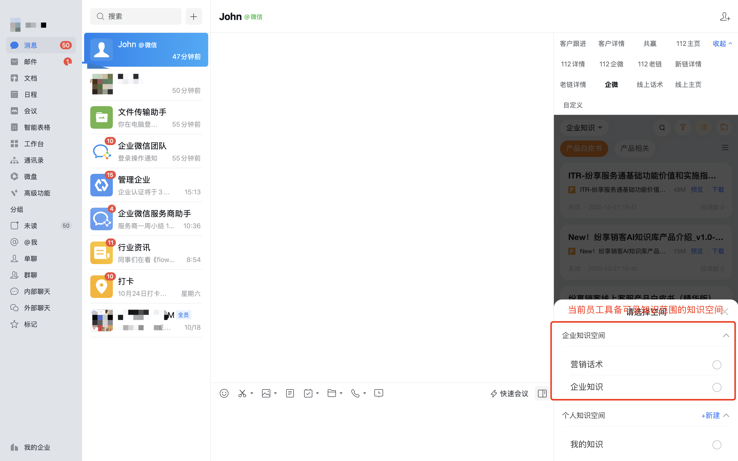 3、员工在企业微信侧边栏进入到知识的菜单即可查询已发布到侧边栏的知识