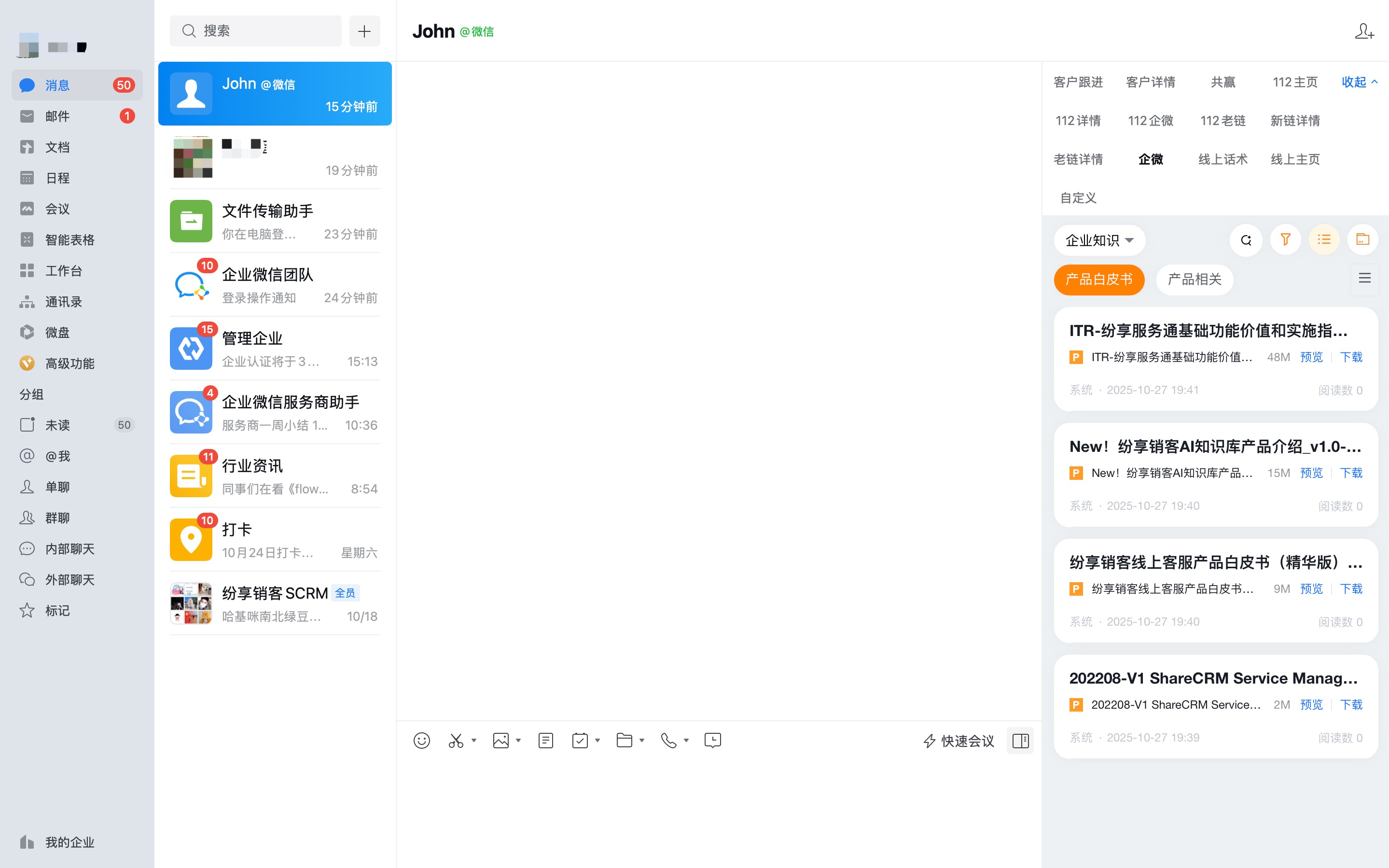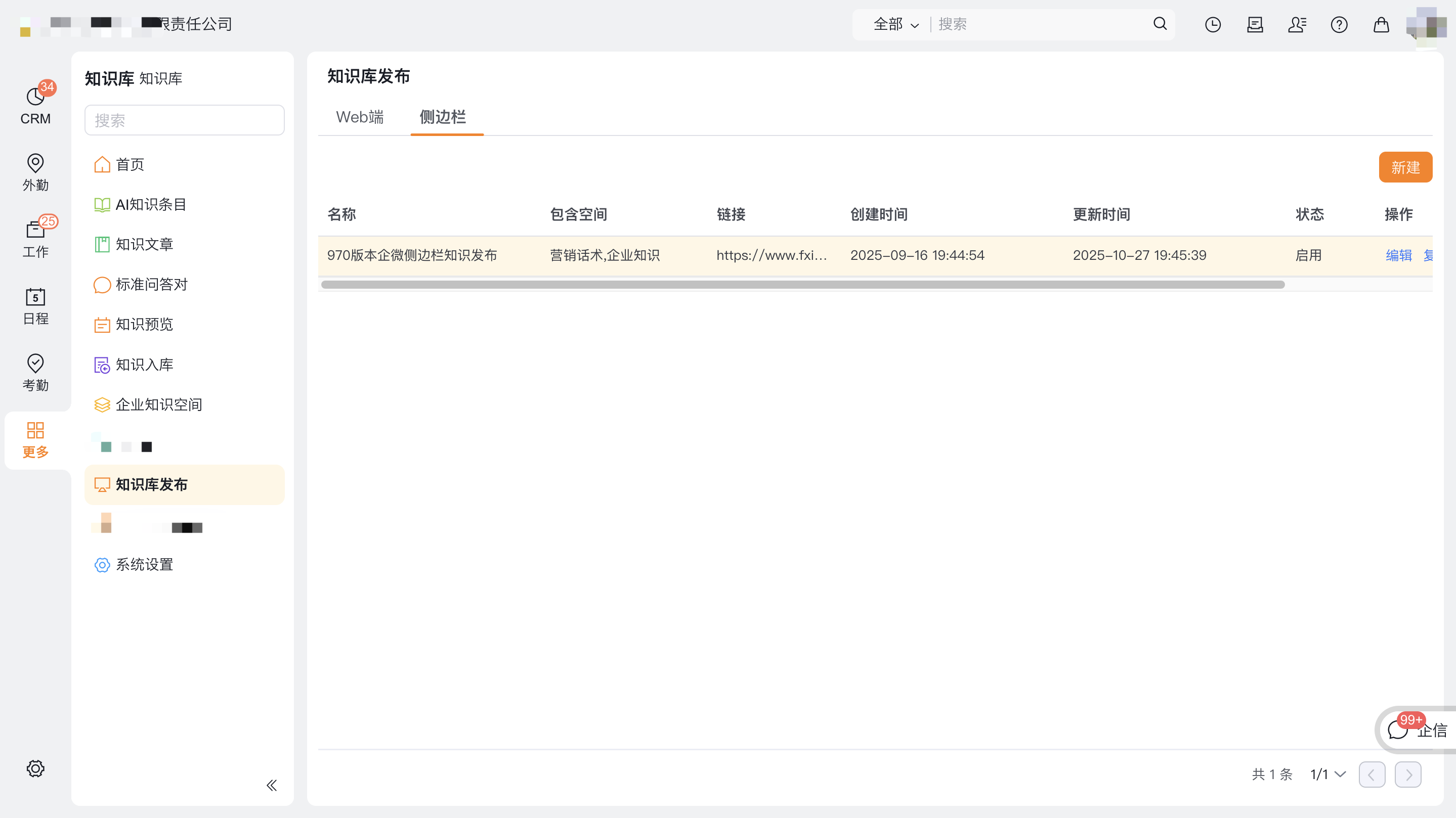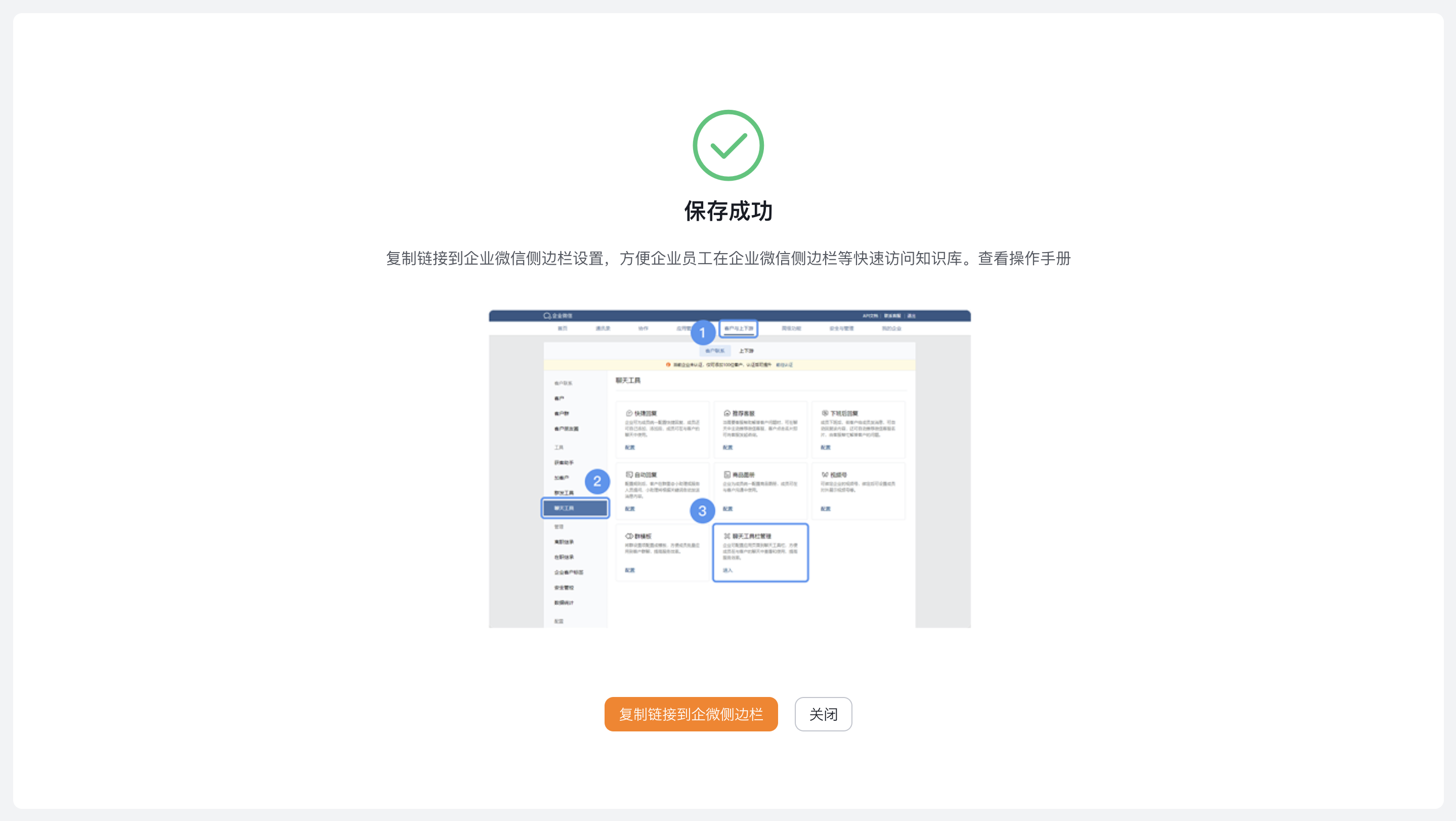 将知识库发布侧边栏给员工使用,如需要发布到企业微信侧边栏(前提:已完成纷享企业账号与企业微信打通)