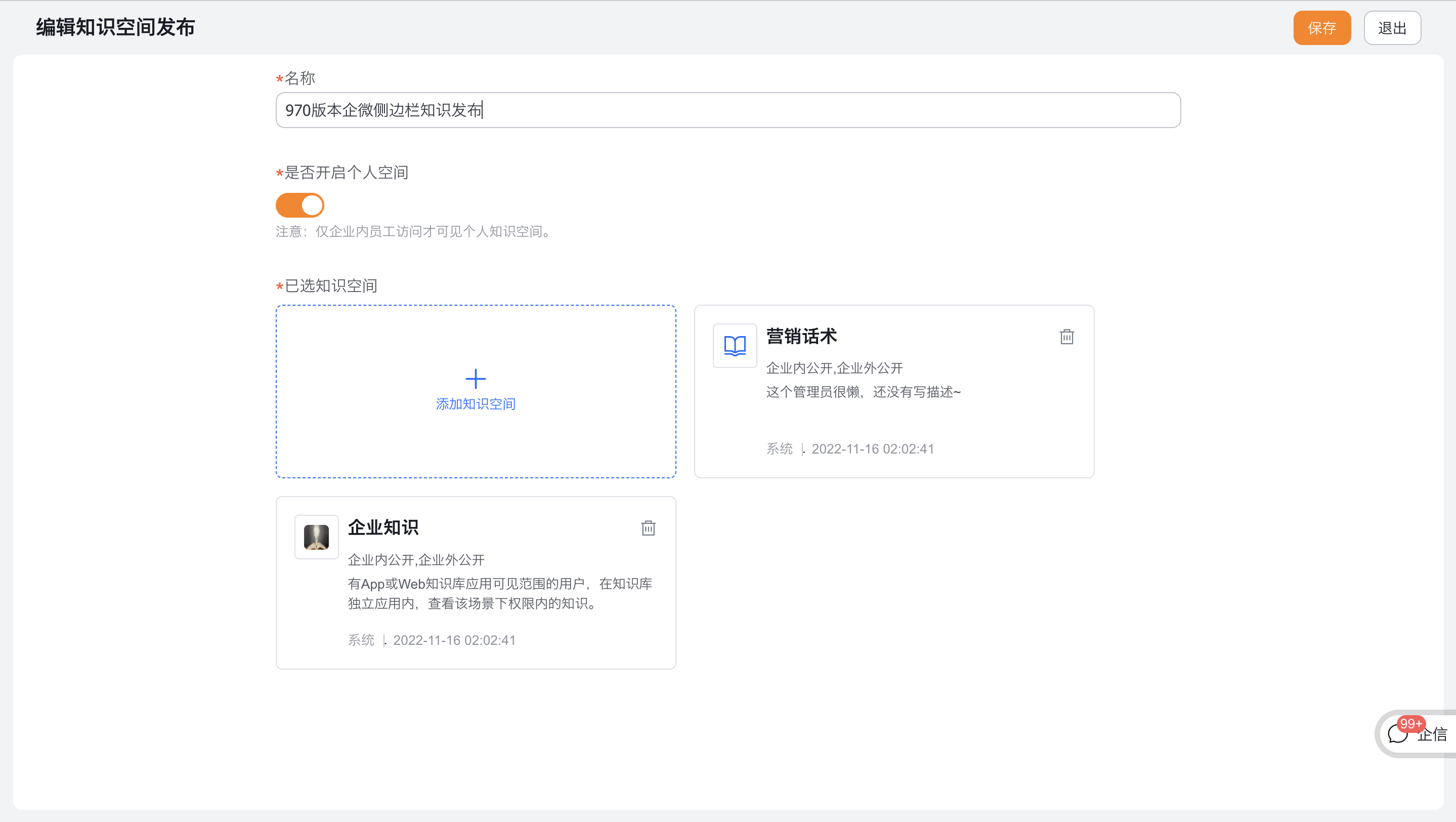 ③添加发布到该渠道的知识空间(一般需要选择企业内可见范围的知识空间),点击保存
