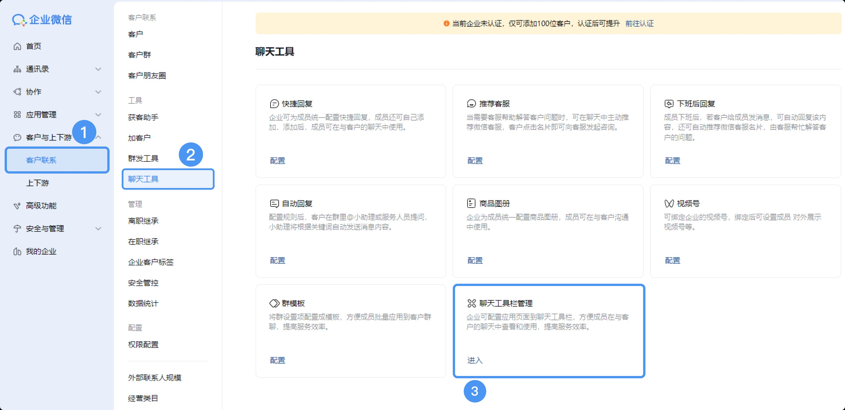 2、复制链接后,前往企业微信后台管理:【管理后台->客户与上下游->客户联系->聊天工具->聊天工具栏管理】