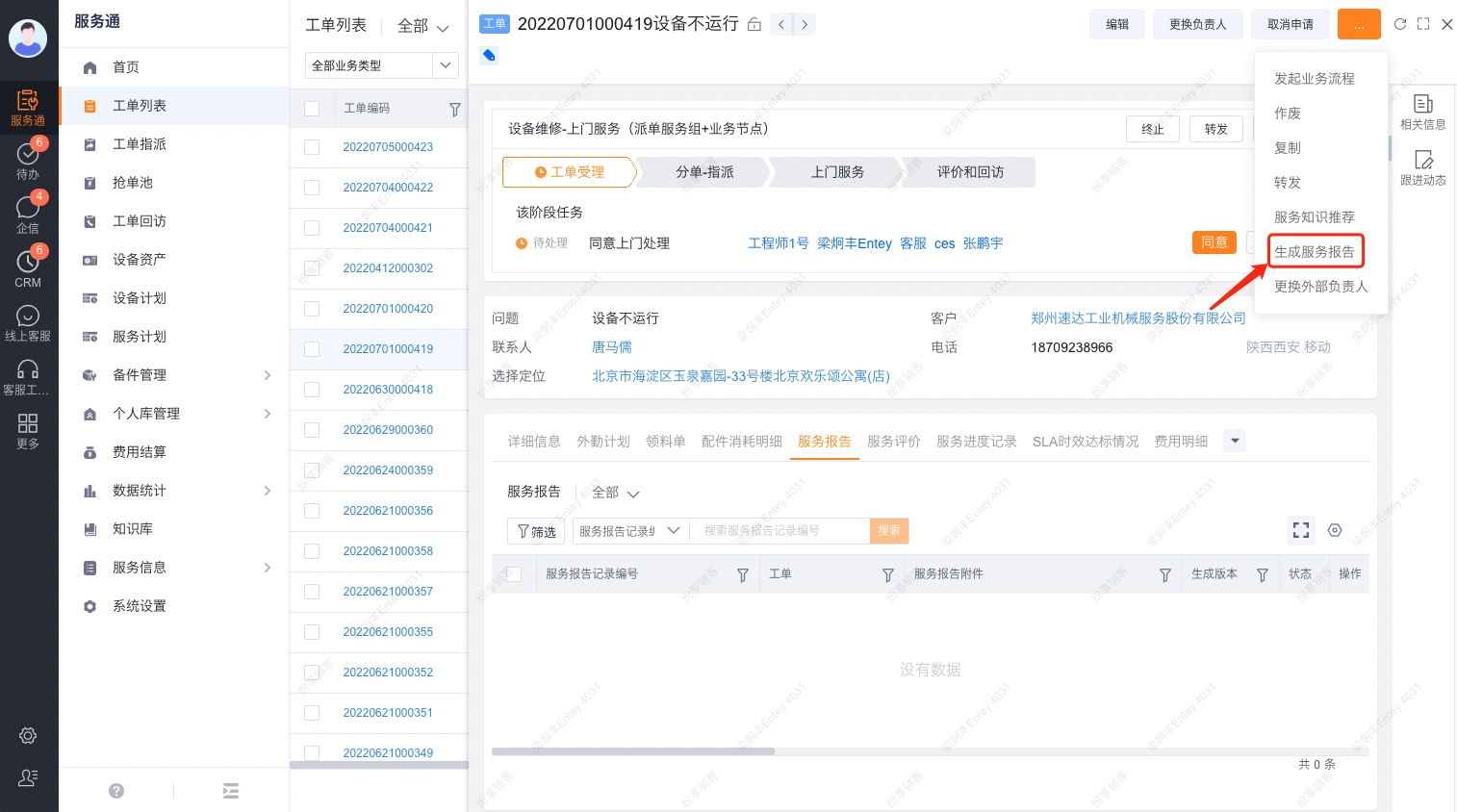 可以在流程节点配置服务报告节点,在流程流转过程中,工程师生成服务报告。
