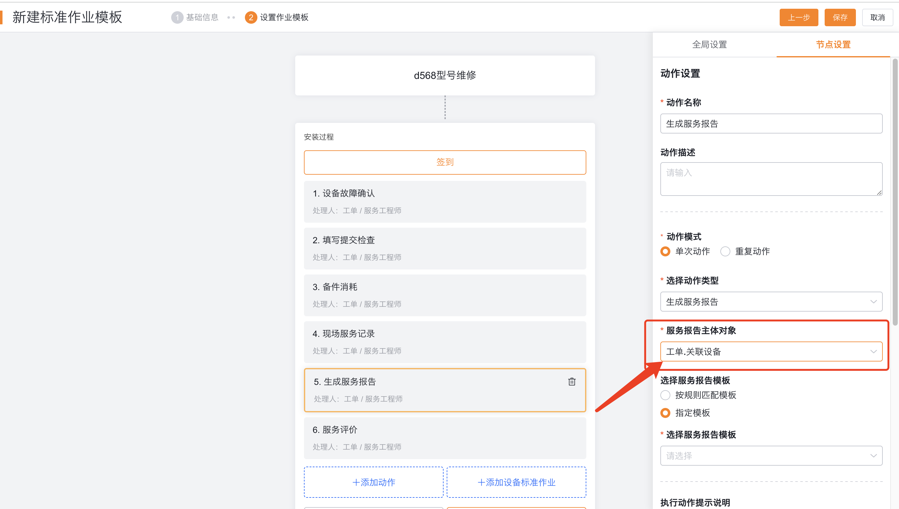 - (单设备工单)生成服务报告:标准作业中,可以添加生成服务报告动作,主体对象为:工单.设备,要求工程师完成全部必填动作后生成服务报告。点击查看现场标准作业(SOP)模板操作手册