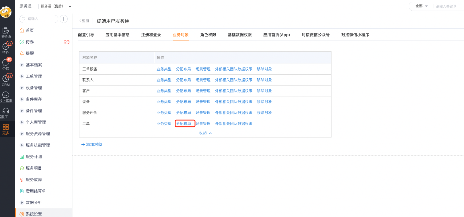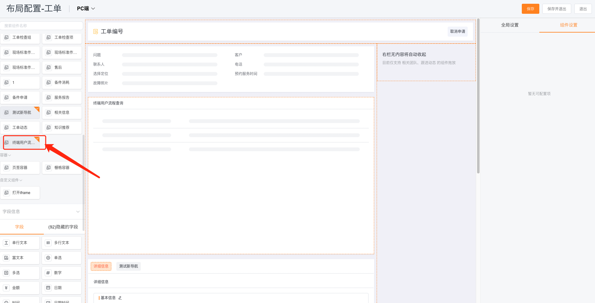 1、在【工单】对象上,定义一个外部终端用户详情页布局,选择组件:终端用户流程进度查询