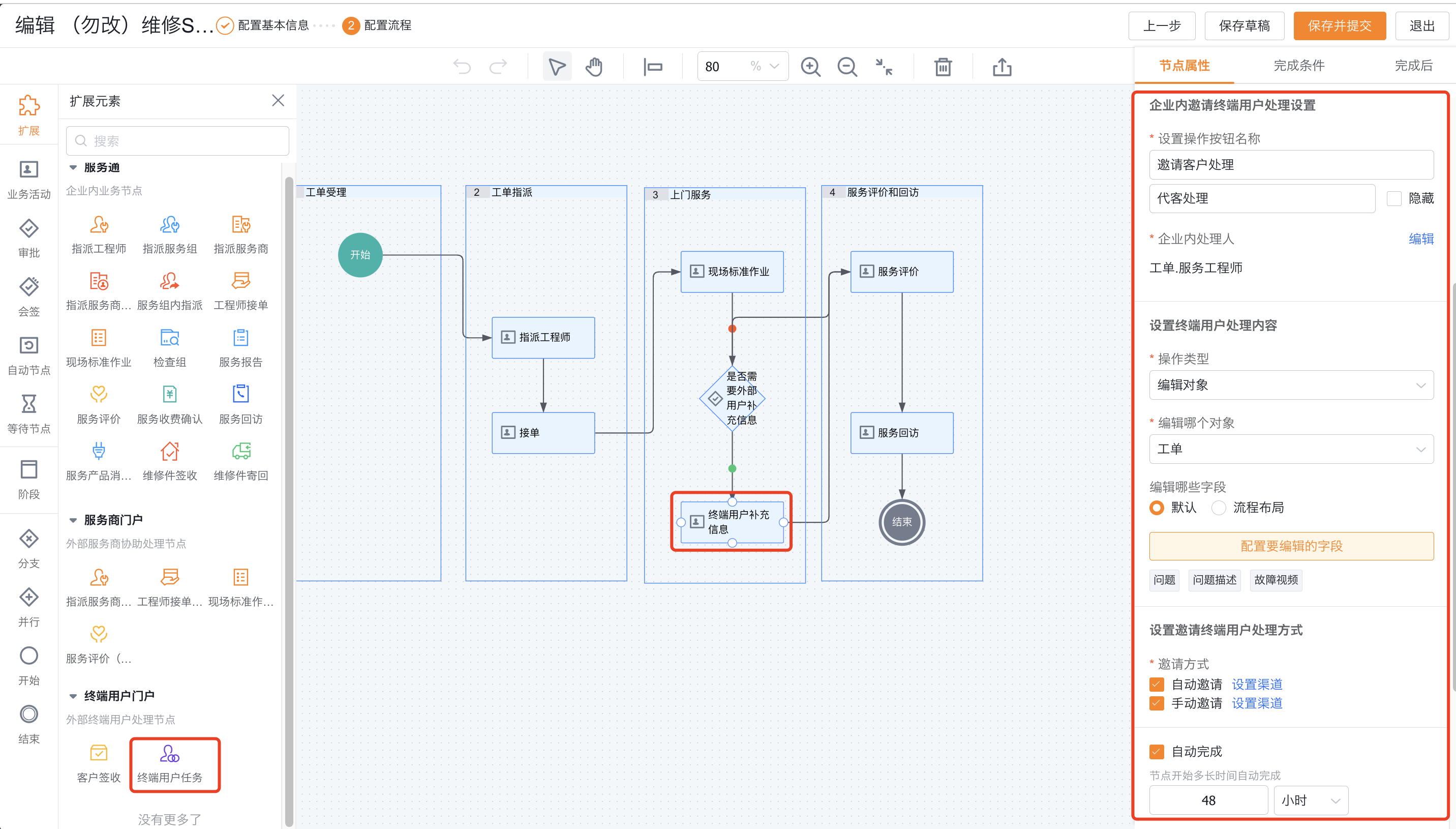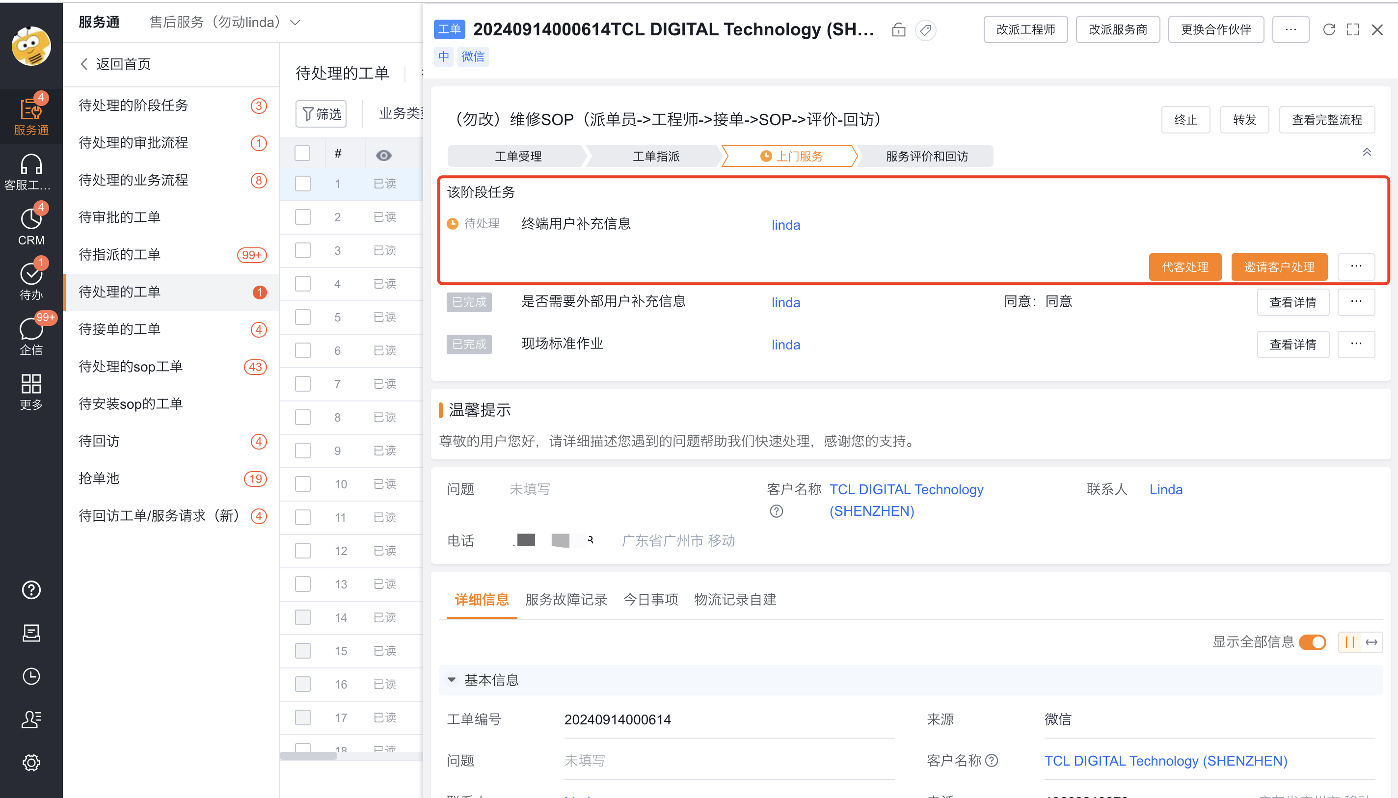- 流程流转到终端用户处理节点,当前处理人可以“邀请客户”处理或代客处理。如果勾选了自动邀请,也会自动触发通知下发。