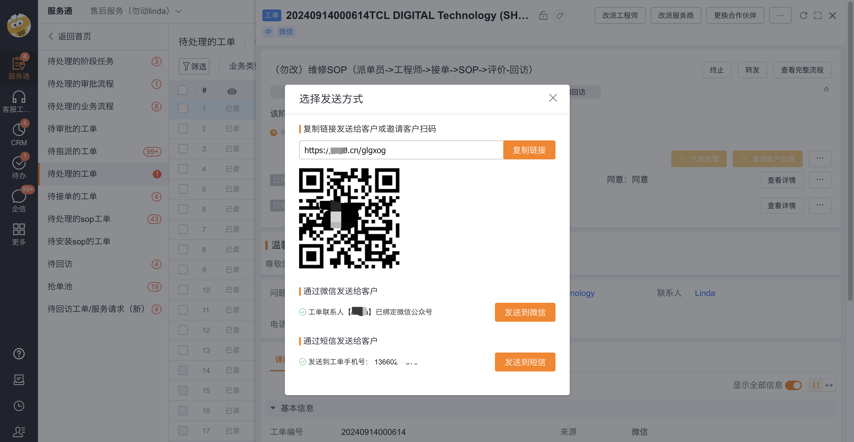 - 点击“邀请客户”处理,按节点设置的处理方式展示: 1)链接 2)微信服务号(发送目标是工单对象的联系人字段(apiname:contact_id)绑定的互联用户) 3)短信(需要消耗短信配额) 4)邮件