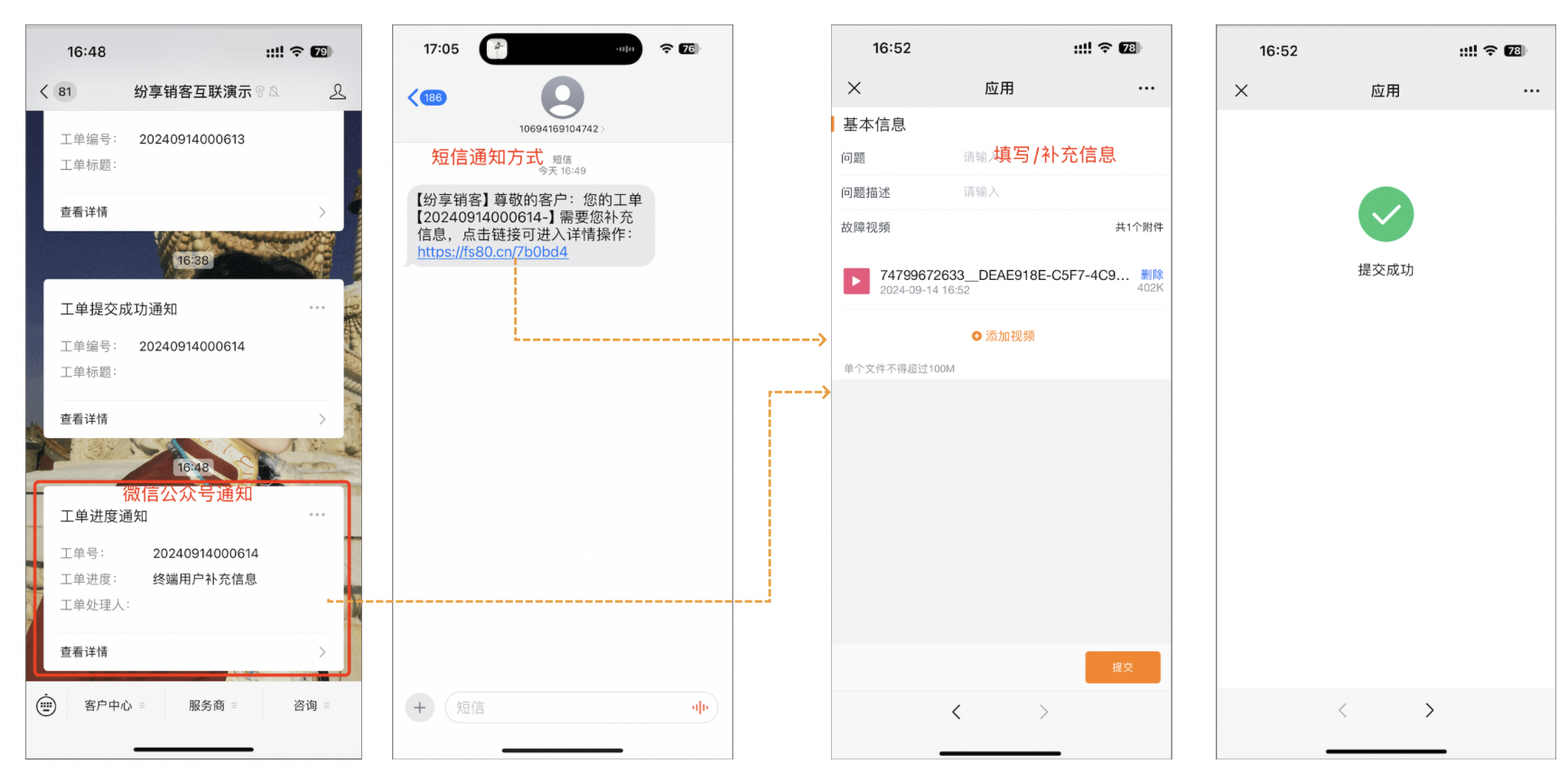 - 推送微信消息:自动推送微信消息邀请客户评价,发送目标:工单对象的外部负责人字段(apiname:out_owner)>绑定的互联用户(当前互联用户第三方账号绑定信息对象数据中微信公众号或小程序已绑定,所以必须一定要结合以下终端用户的注册的规则:https://help.fxiaoke.com/1a54/4107/2f99/368b/6bfb#header-8、https://help.fxiaoke.com/1a54/4107/2f99/368b/6bfb#header-9、https://help.fxiaoke.com/1a54/4107/2f99/368b/6bfb#header-10