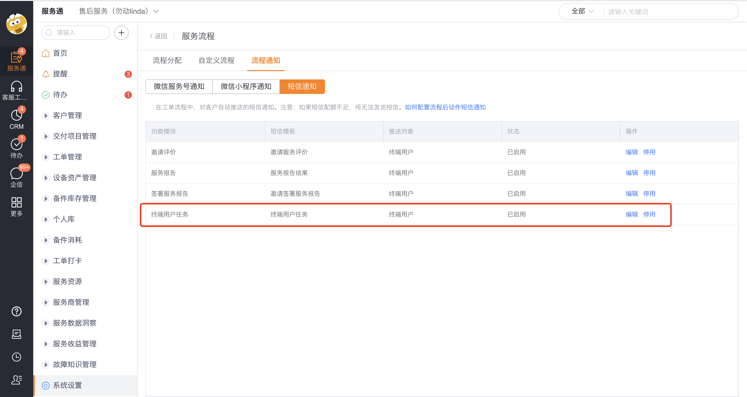 - 注意:服务评价微信消息推送需要排查预设的微信模板通知已启用:预设微信服务号通知、预设微信小程序通知