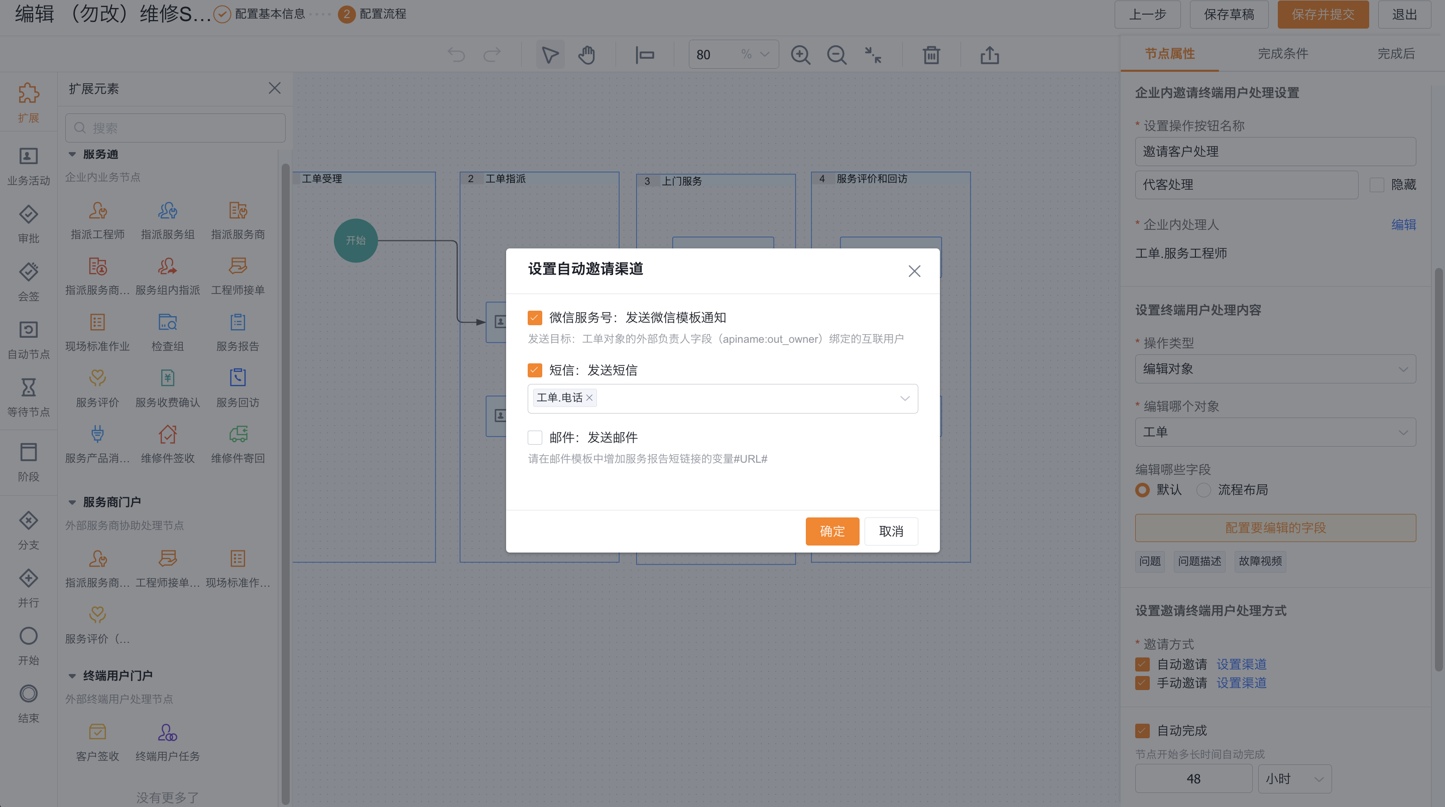 - 设置邀请终端用户处理的方式,选择自动邀请或者手动邀请: 1)链接 2)微信服务号(发送目标是工单对象的联系人字段(apiname:contact_id)绑定的互联用户) 3)短信(需要消耗短信配额) 4)邮件