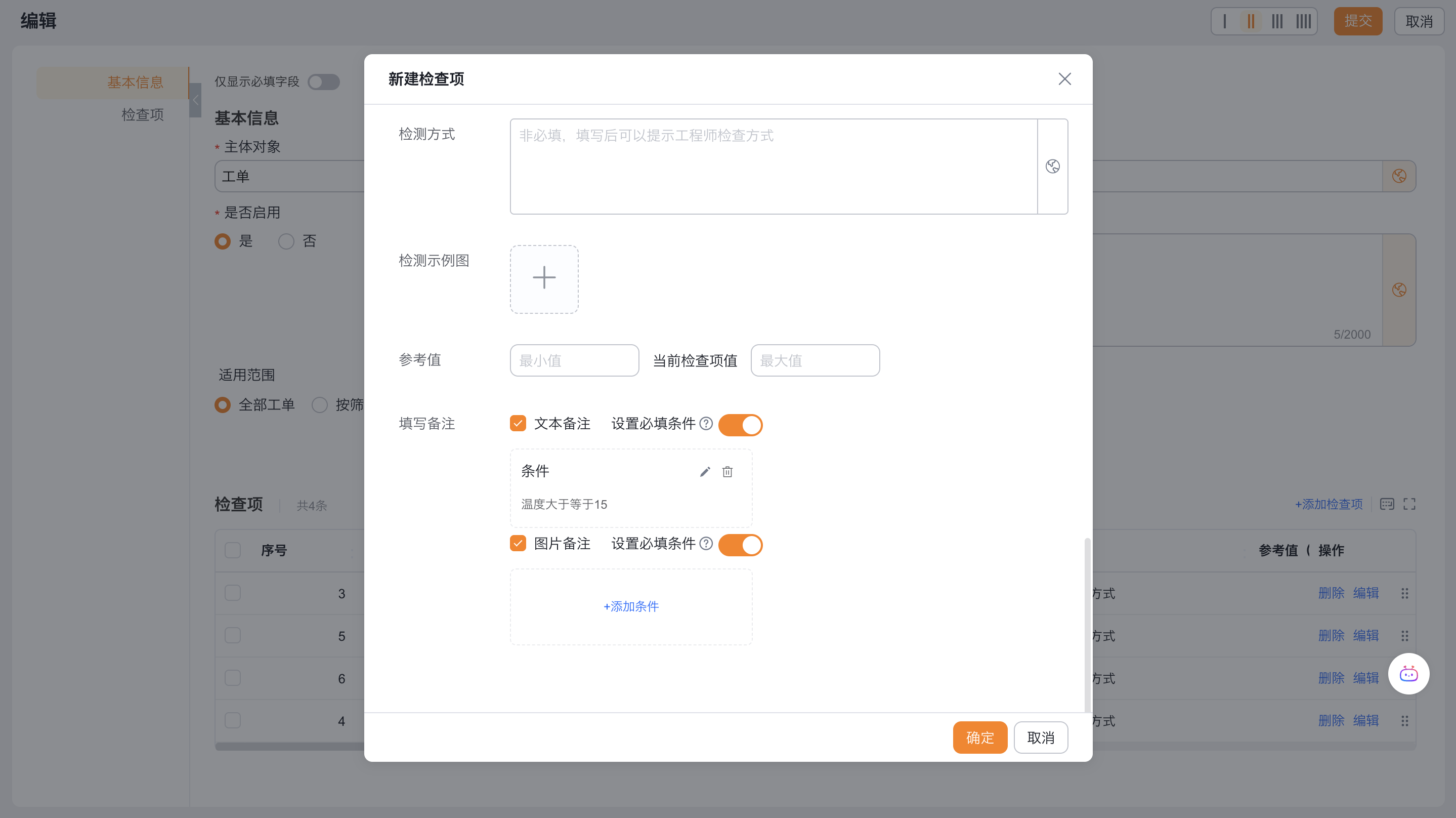 - 填写备注:即需要工程师额外补充的备注,文本或图片,不勾选则工程师填写时候不出现填写备注入口,可以设置符合某些条件要求备注必填,如检查项温度超过目标值,要求工程师必须在备注备注信息或上传备注图片。