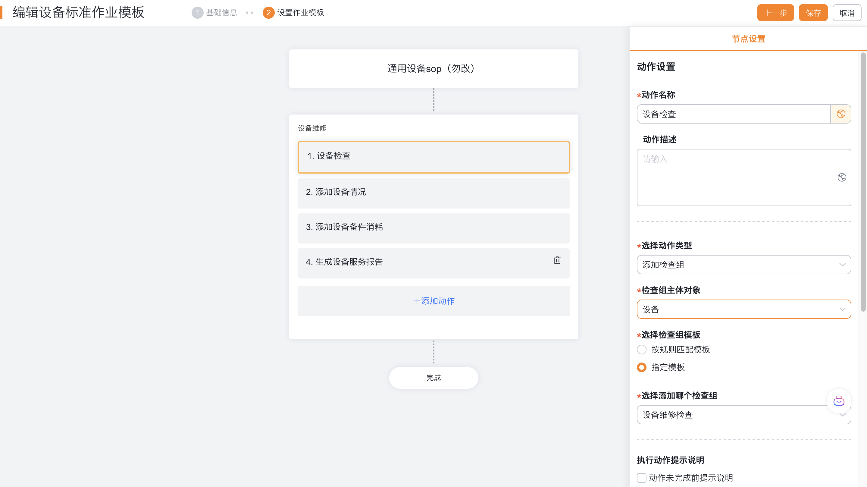 - 设备标准作业中,可以添加检查组动作。点击查看现场标准作业(SOP)模板操作手册