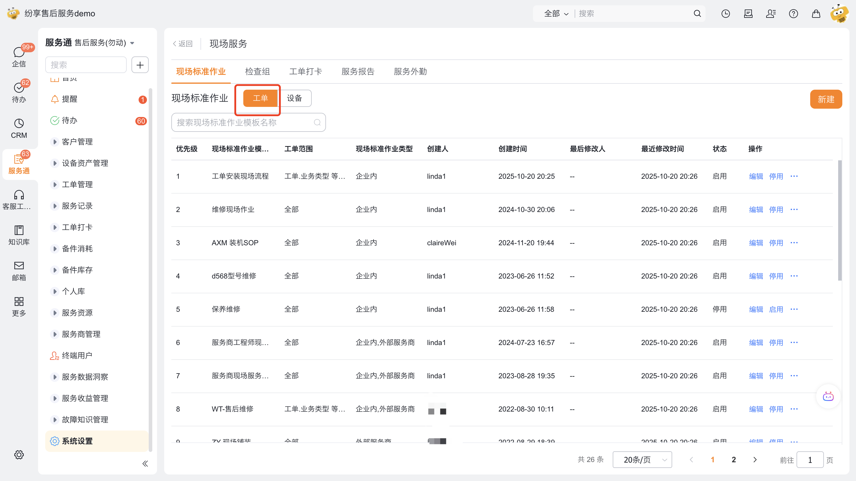 - 处理人:默认处理人是工单人员字段“服务工程师”