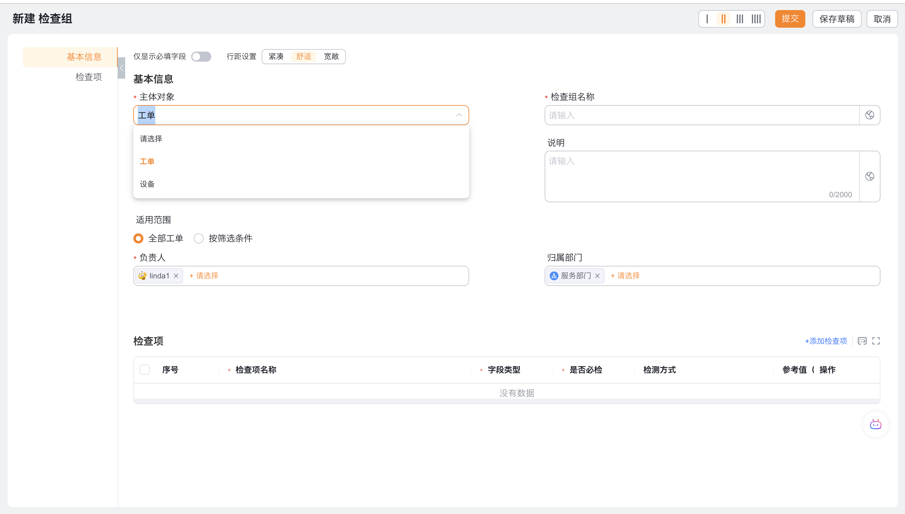 2、选择当前检查组的主体对象:工单或设备即当前检查组是针对于工单检查或设备检查(当前主体影响后续在sop或检查组流程节点中的主体选择。)
